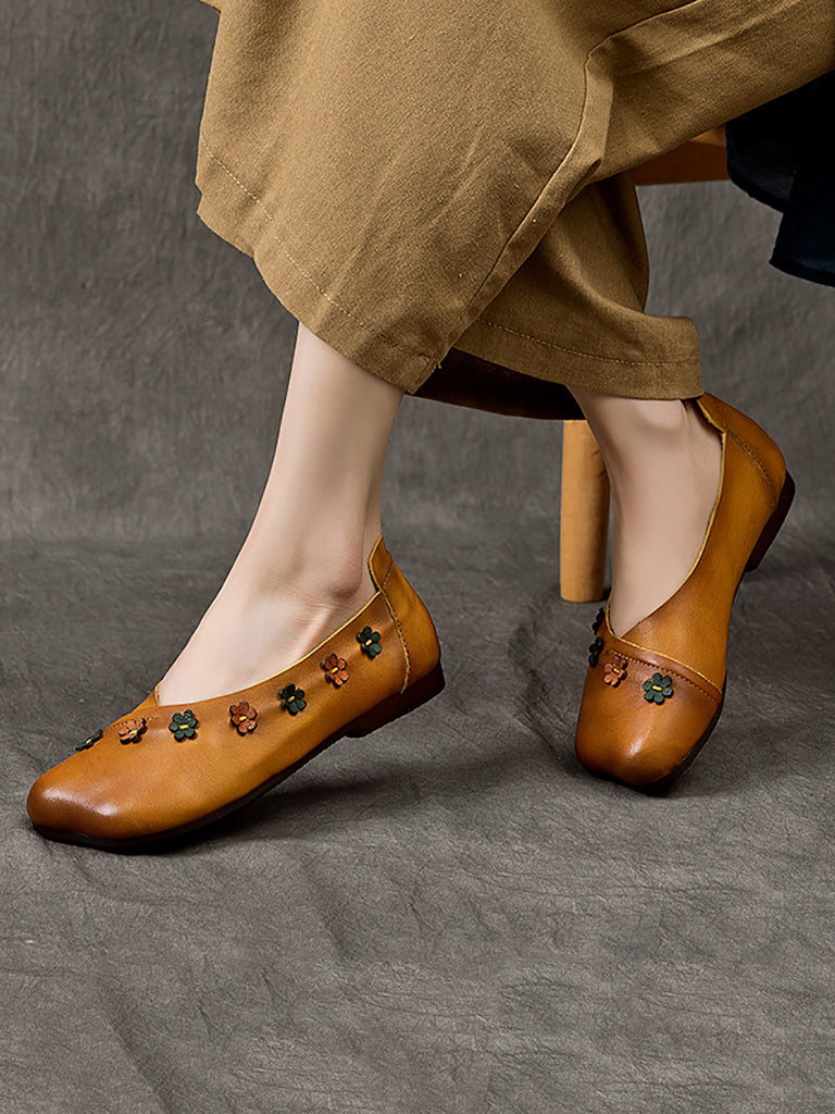 Scarpe basse estive vintage in pelle con fiori intrecciati da donna
