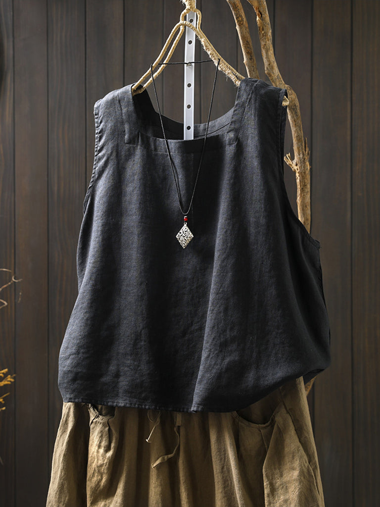 Gilet estivo in lino con colletto quadrato, vintage, di colore puro, da donna