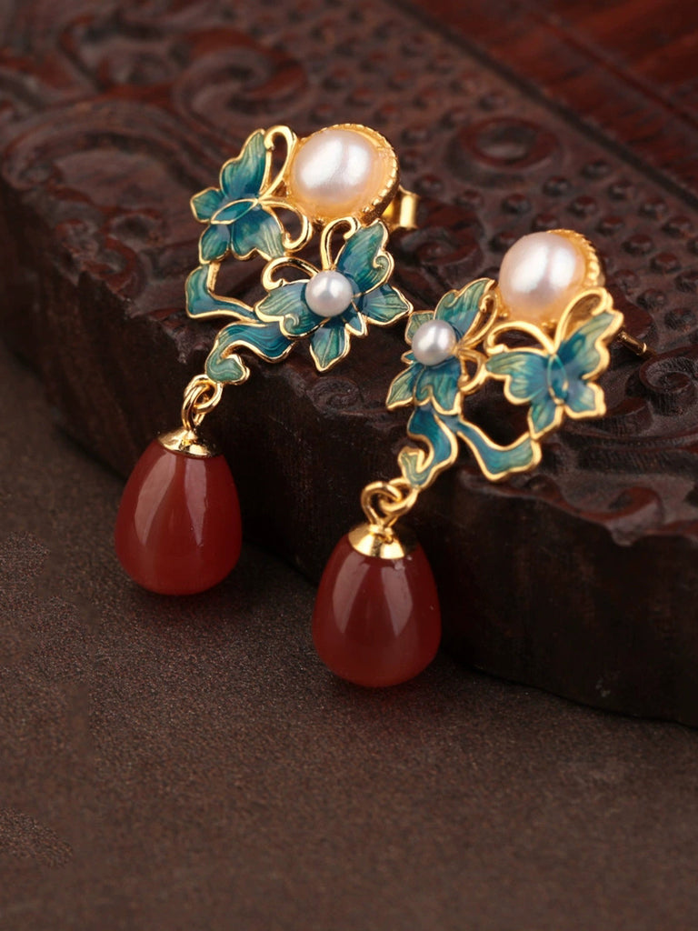 Orecchini da donna etnici in smalto a forma di farfalla in argento 925 con perle e agata