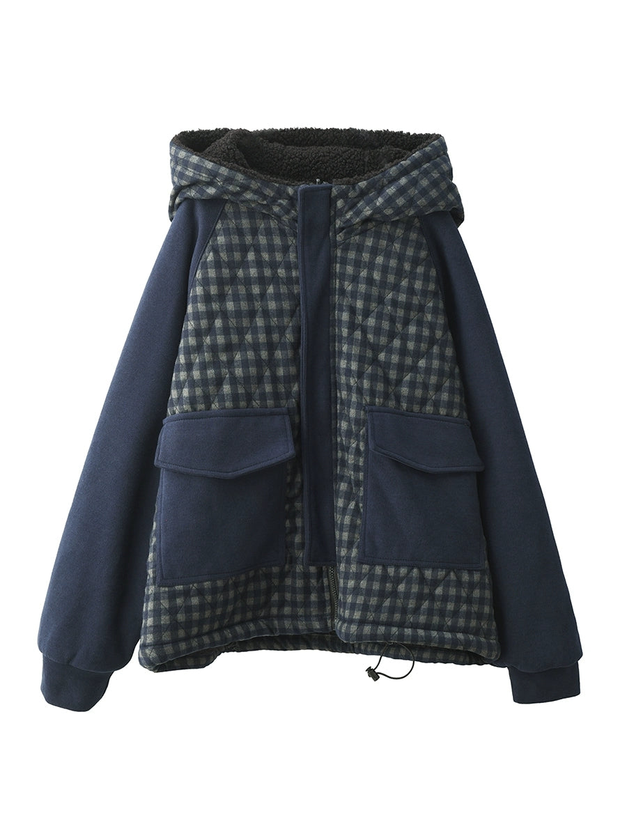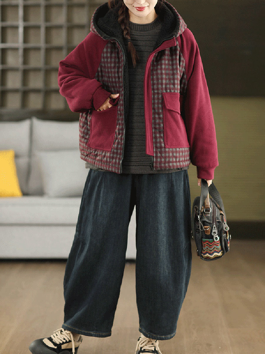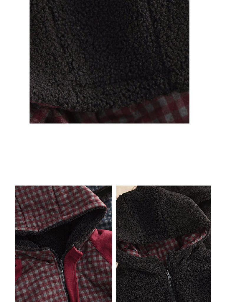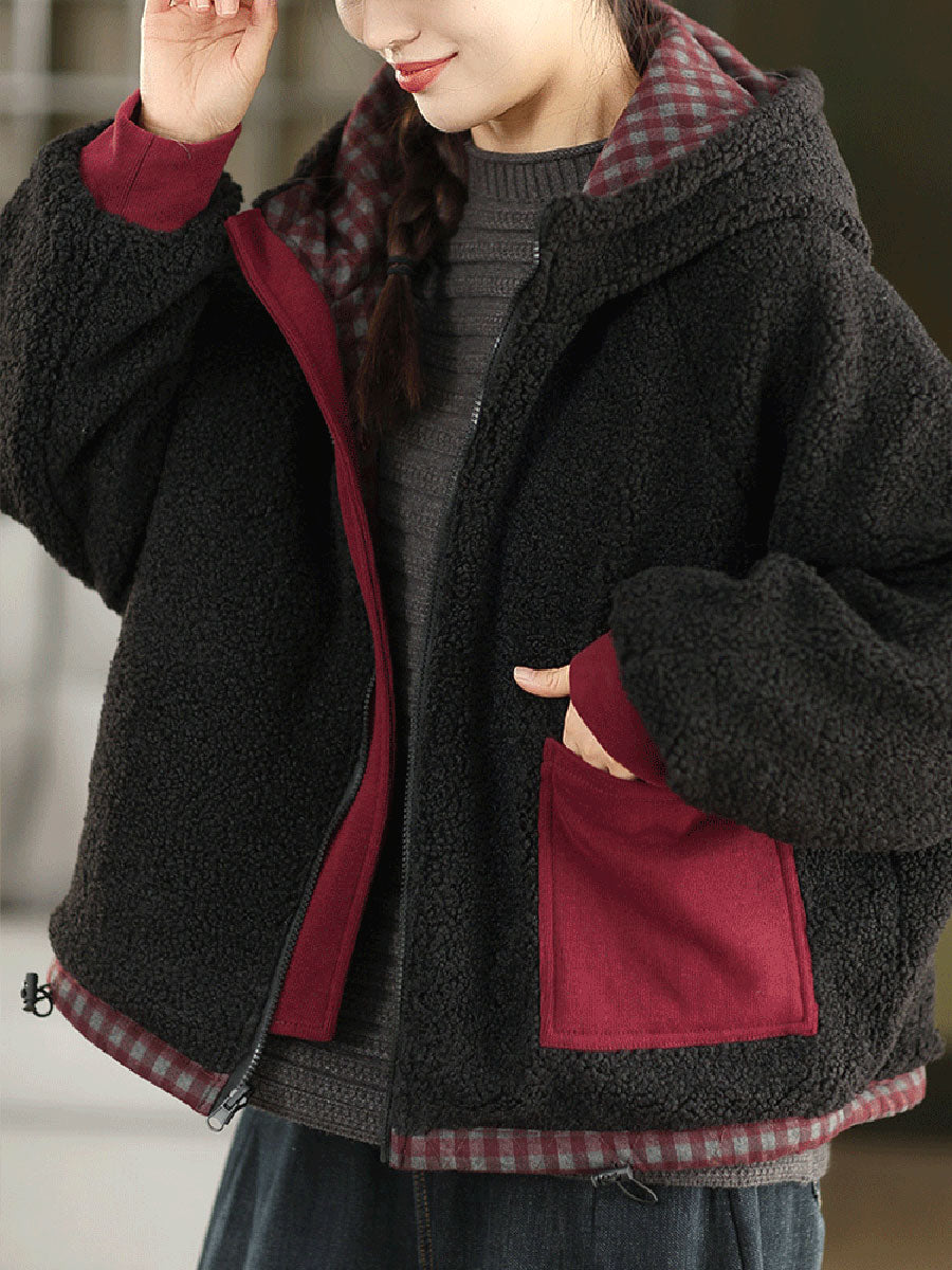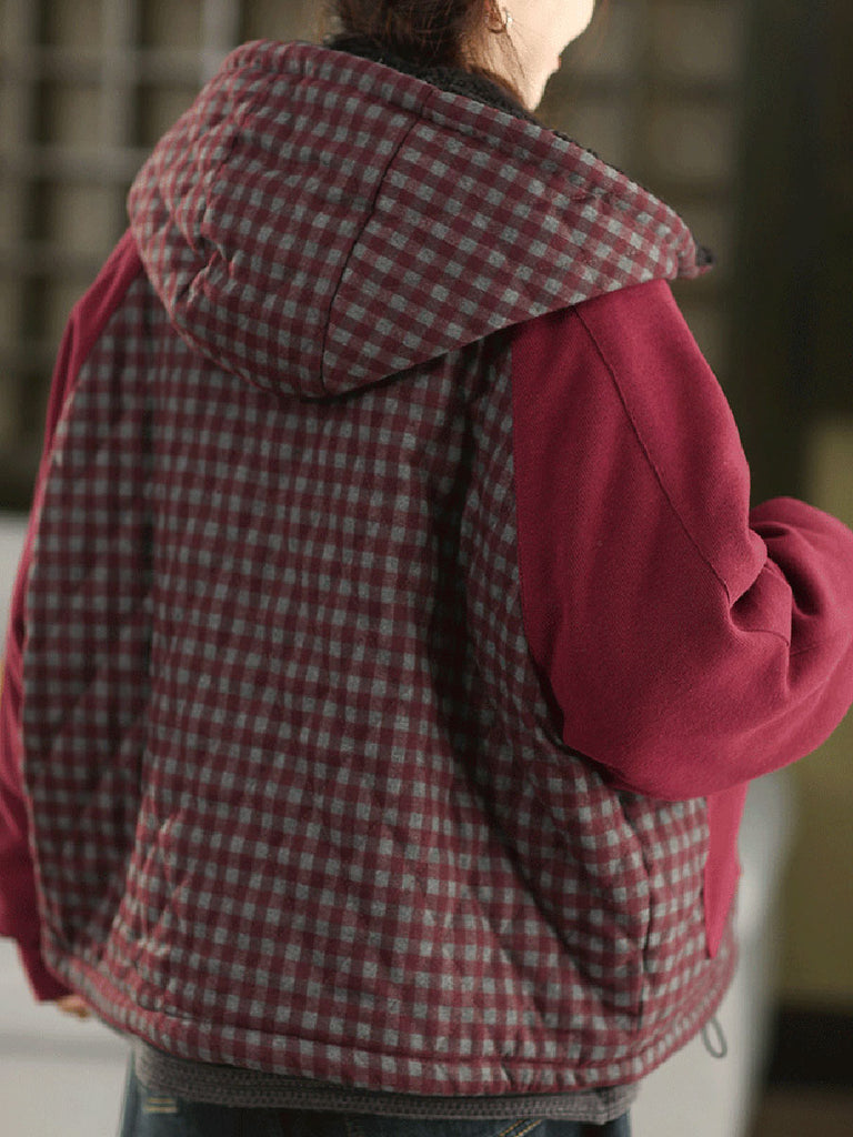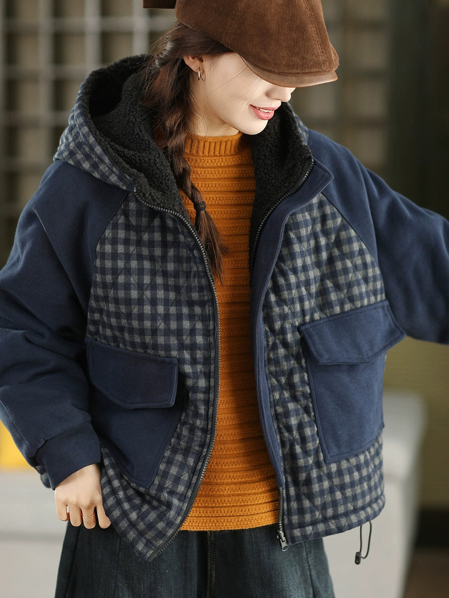 Cappotto invernale da donna con cappuccio e fodera in pile, doppio lato, a quadri