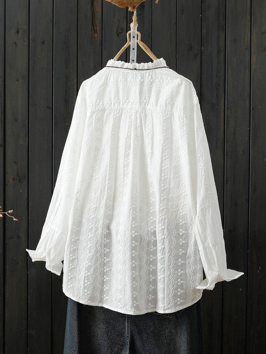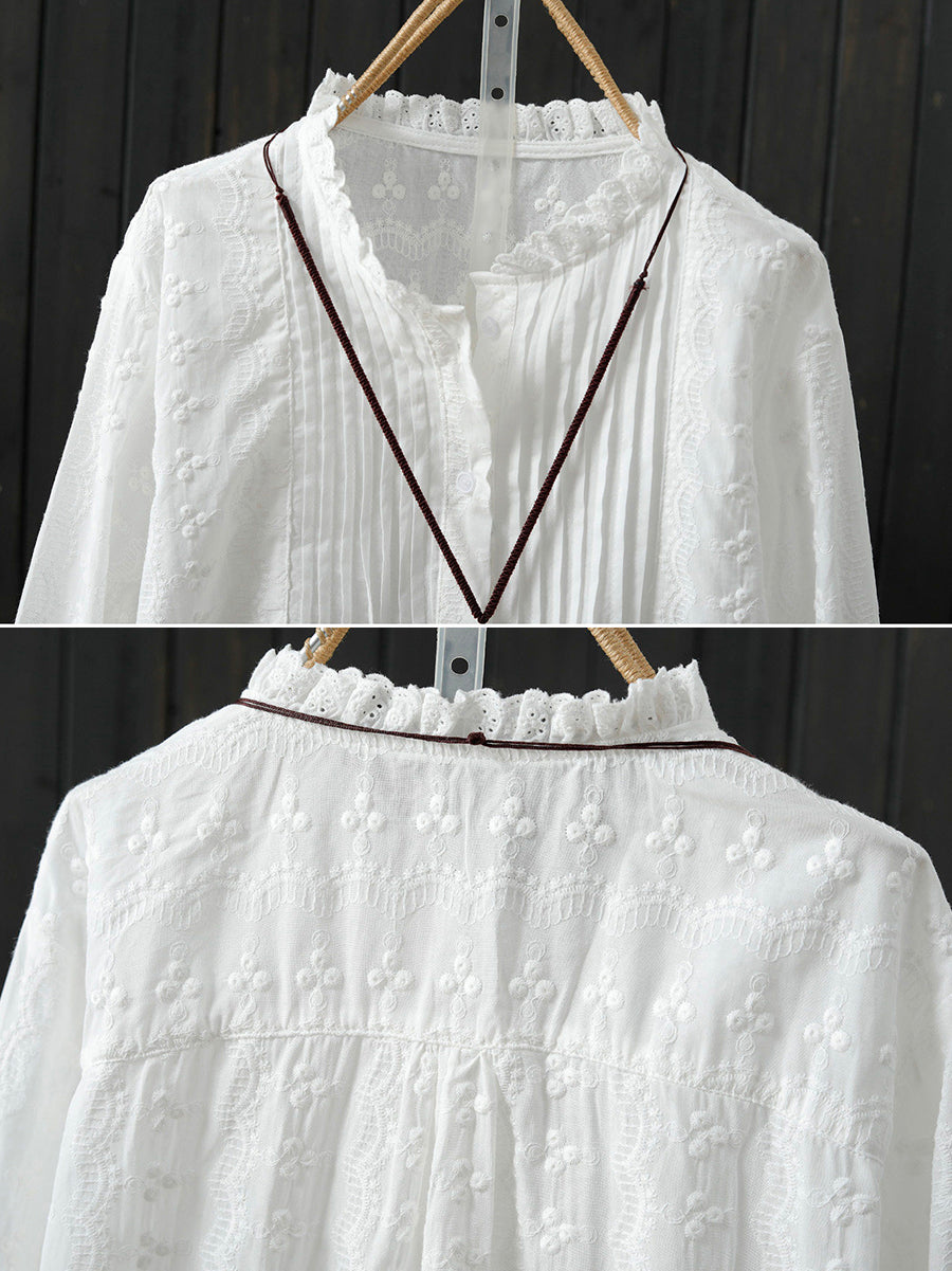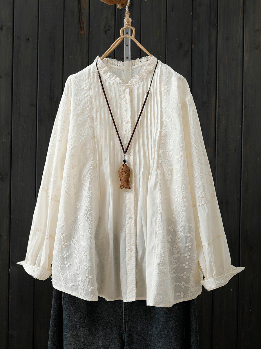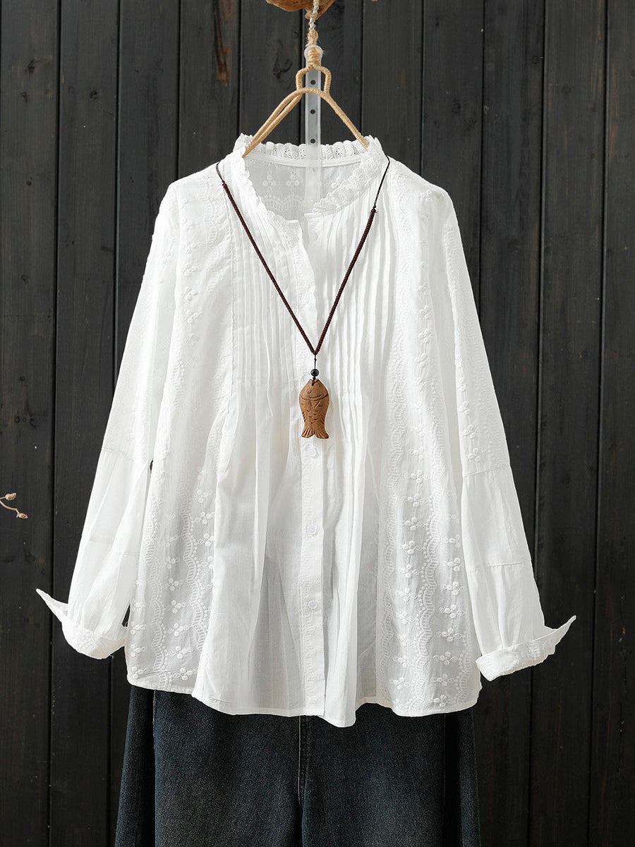 Camicia da donna primaverile con ricamo artistico e arricciatura in 100% cotone