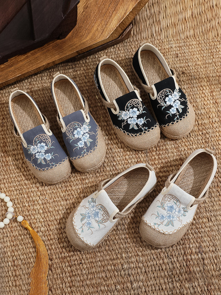 Scarpe estive vintage da donna in tessuto di lino con fiori