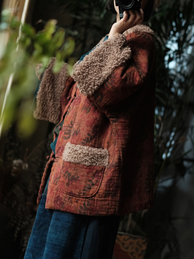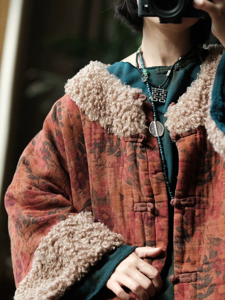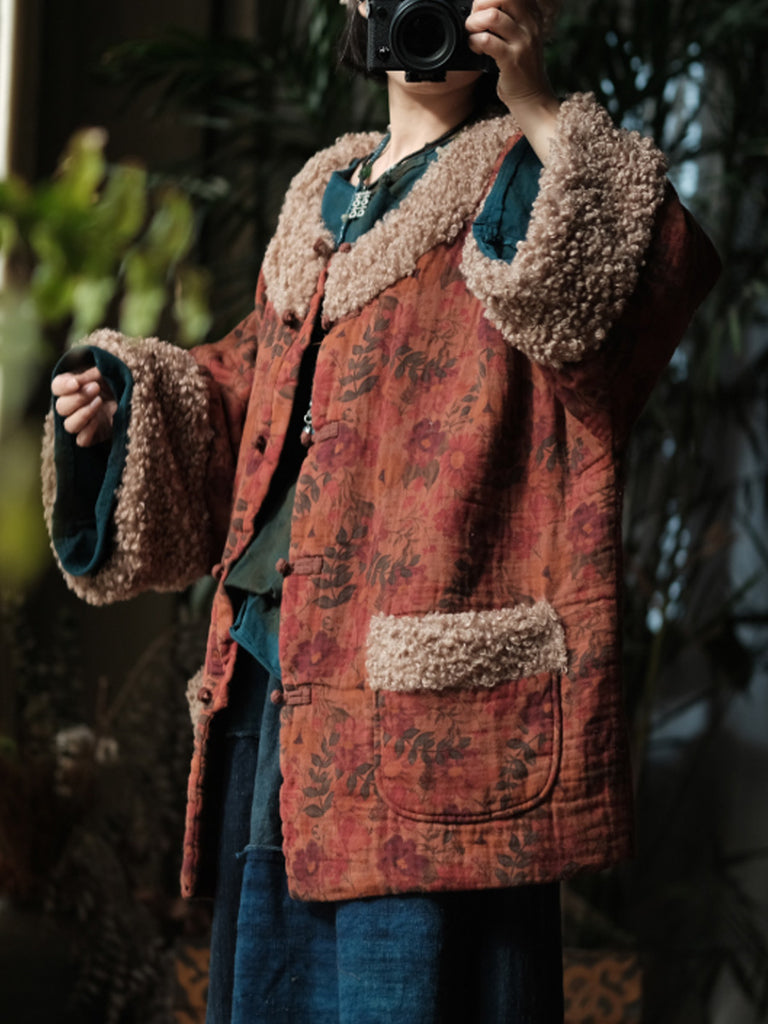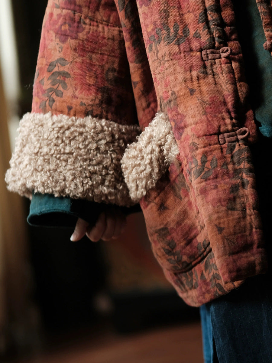 Cappotto da donna vintage invernale in pile con fiori e scollo a V in cotone
