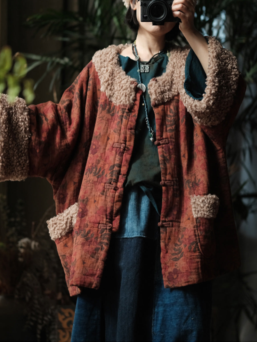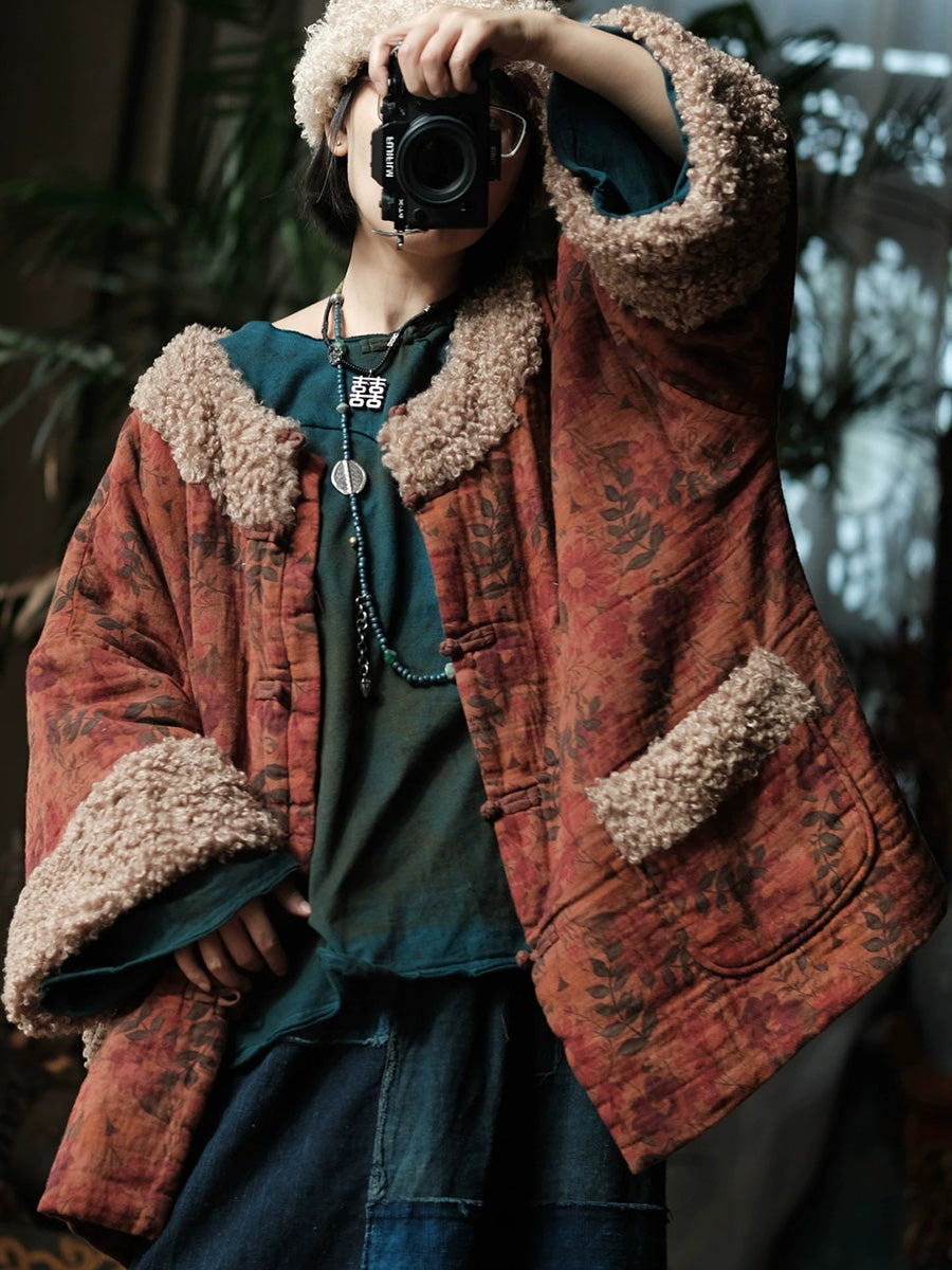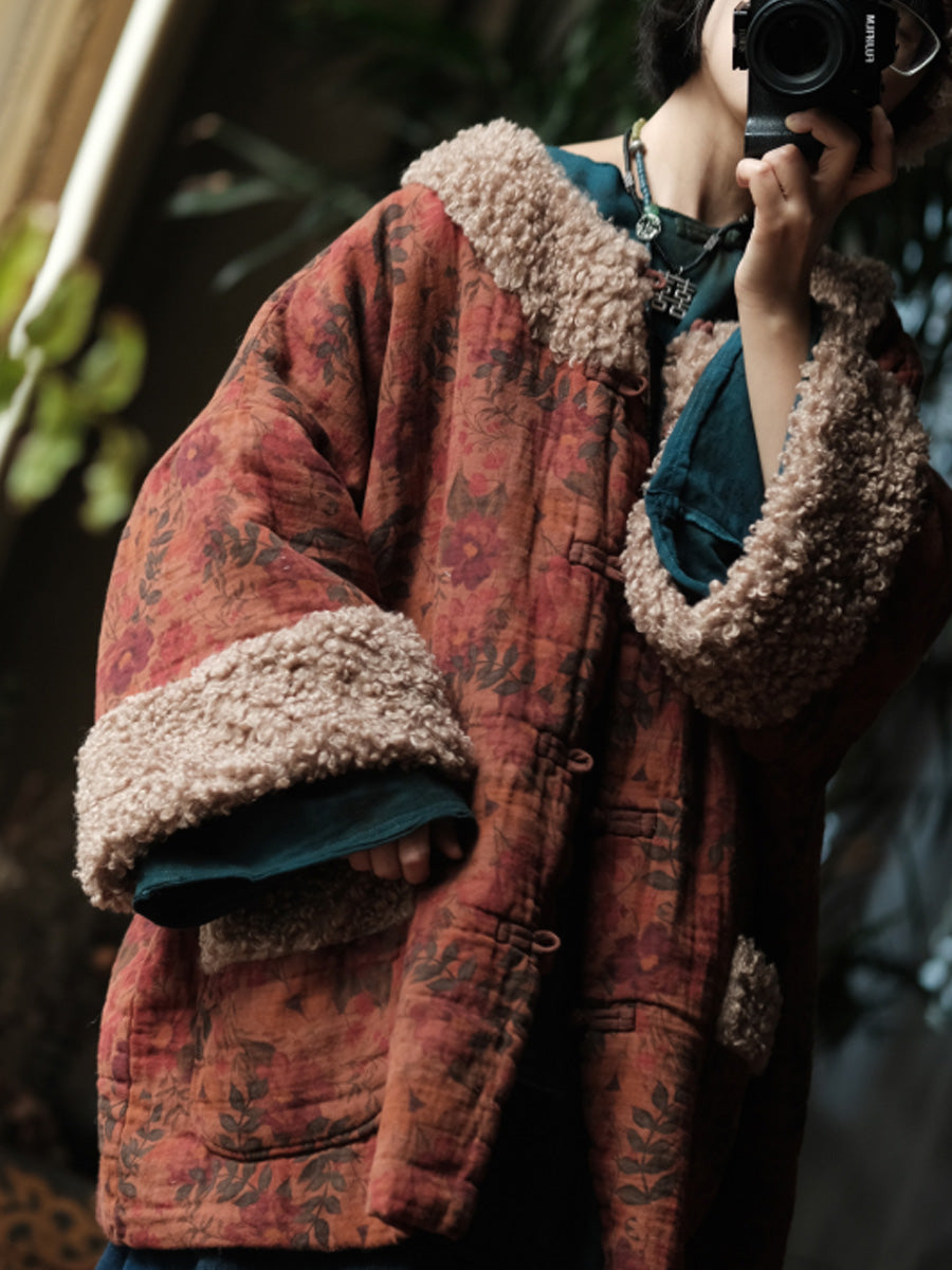 Cappotto da donna vintage invernale in pile con fiori e scollo a V in cotone