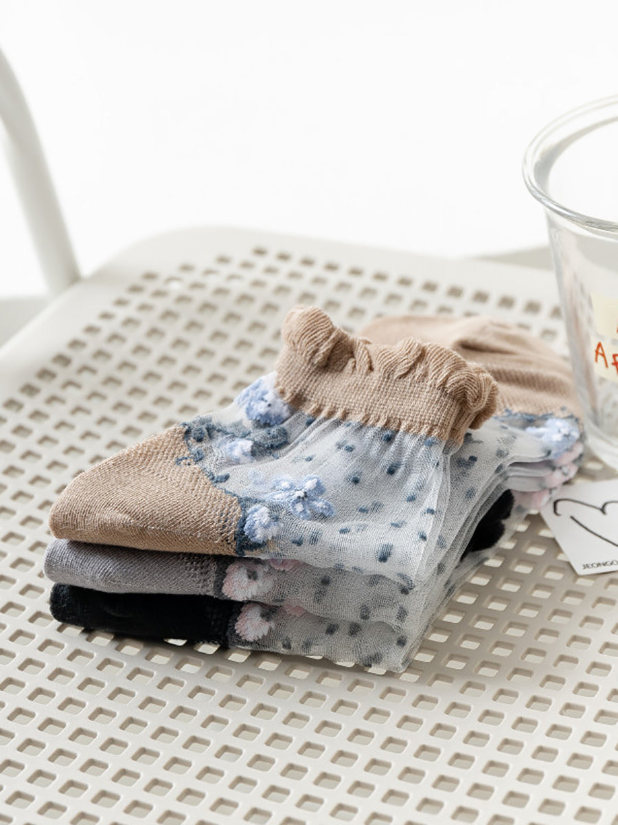 3 paia di calzini da donna in pizzo jacquard con fiori artistici