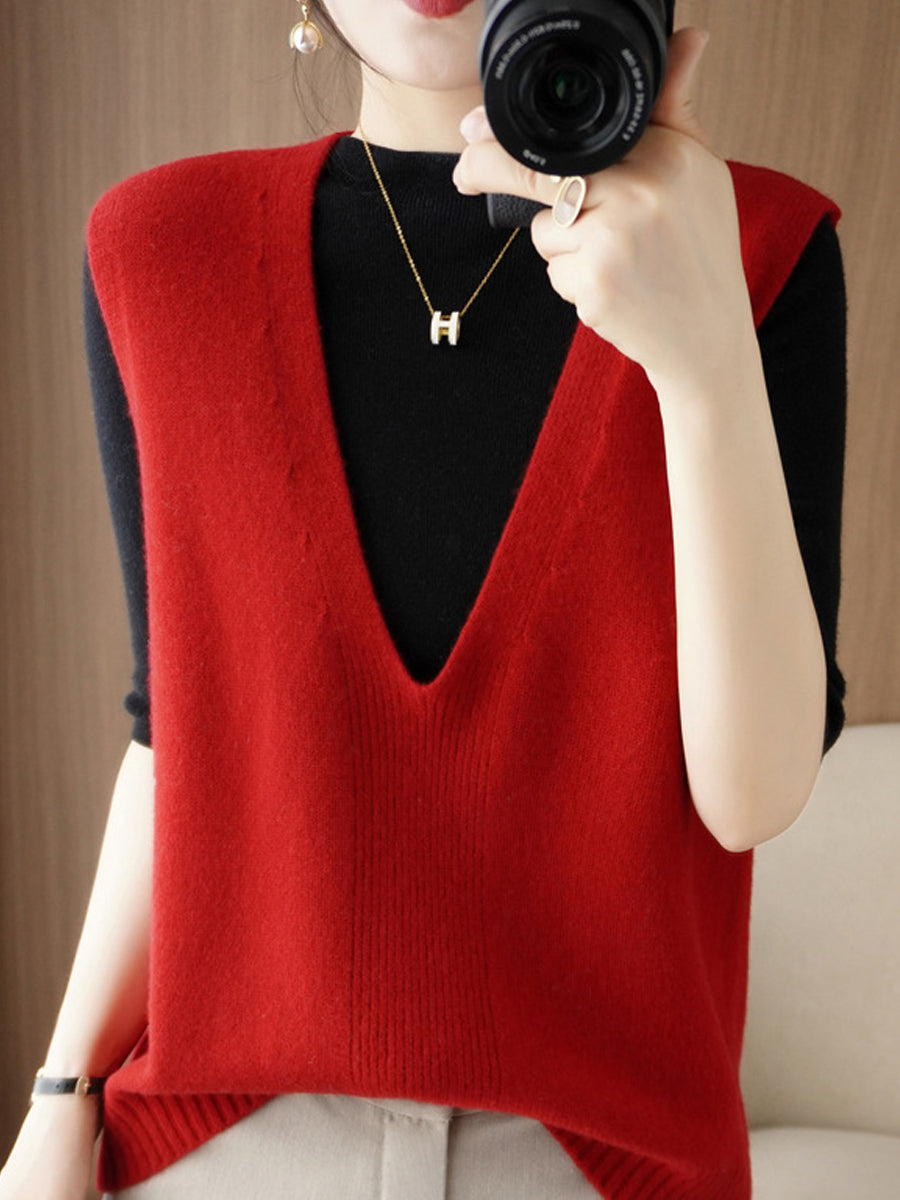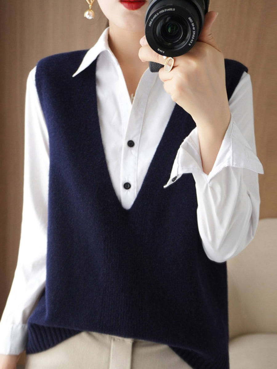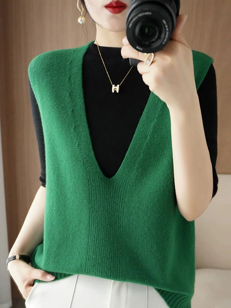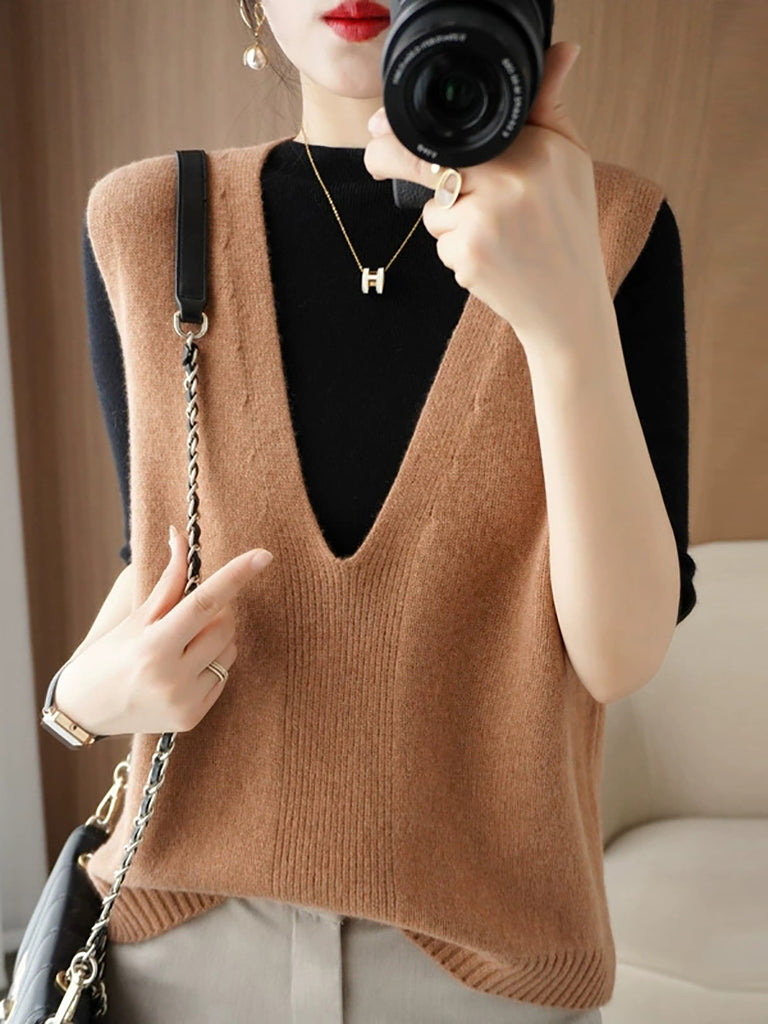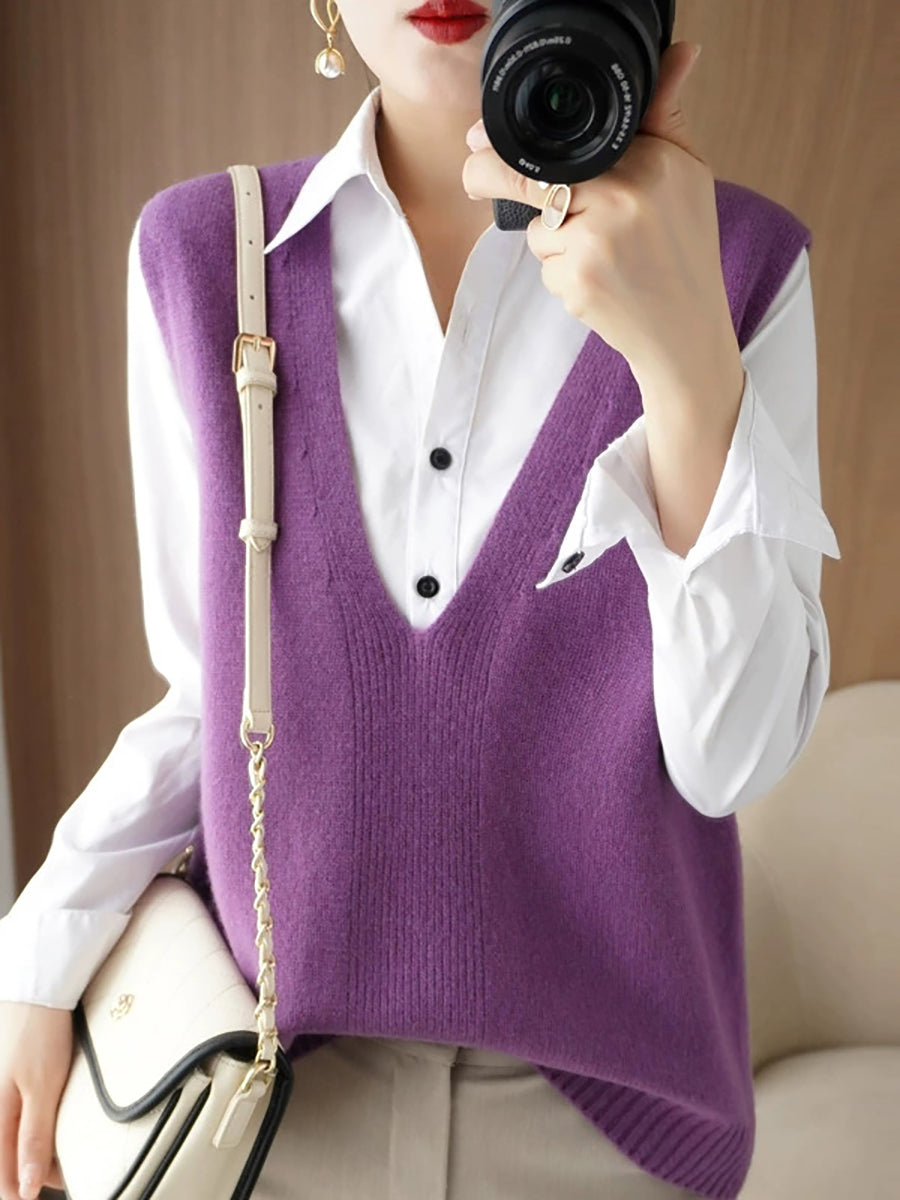 Gilet lavorato a maglia con scollo a V, casual, autunnale, da donna, in tinta unita