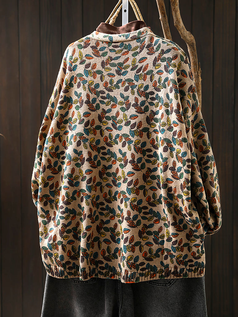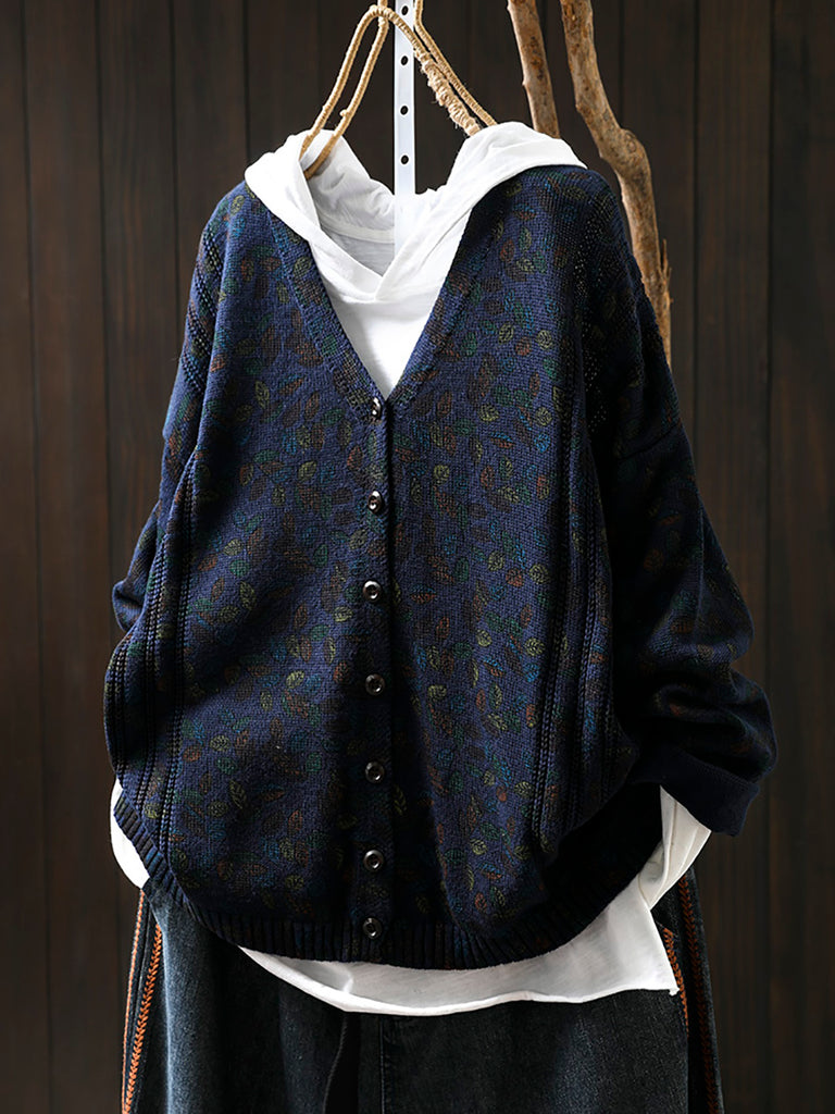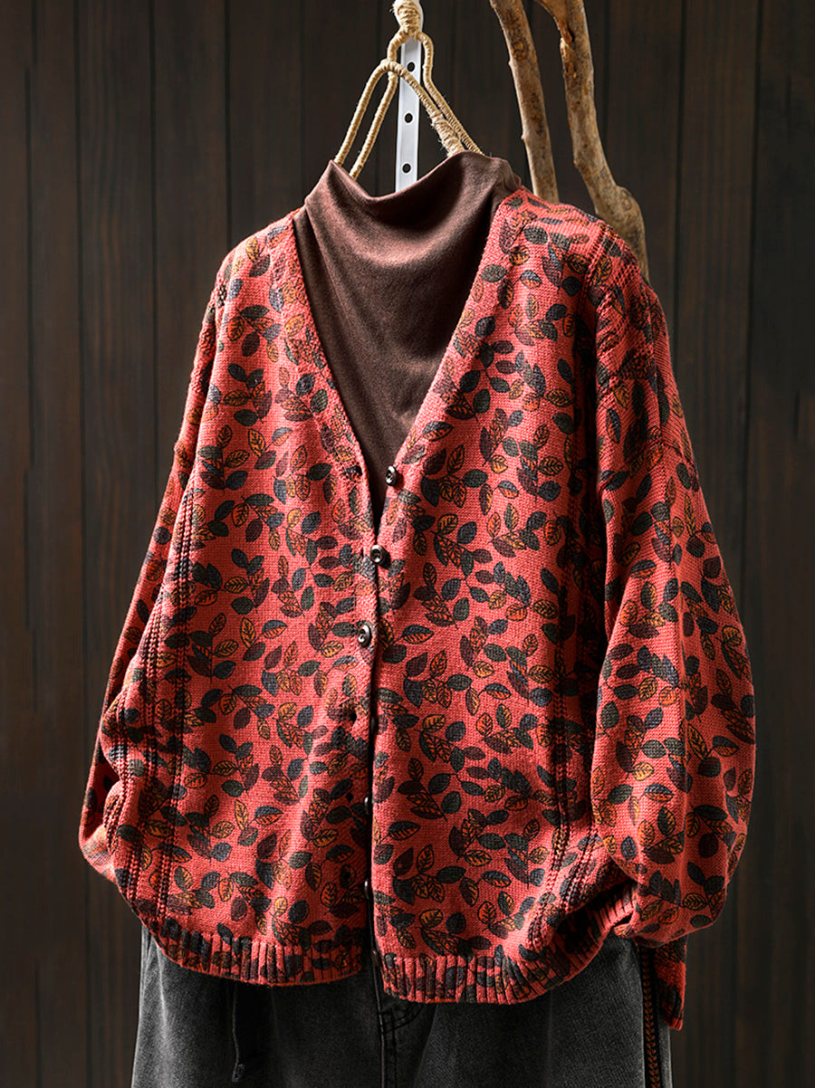 Cardigan lavorato a maglia con scollo a V e motivo a foglie autunnali da donna