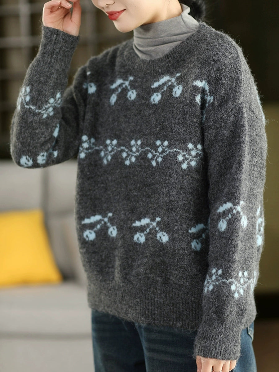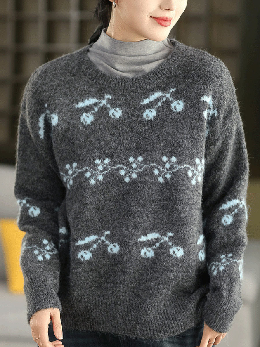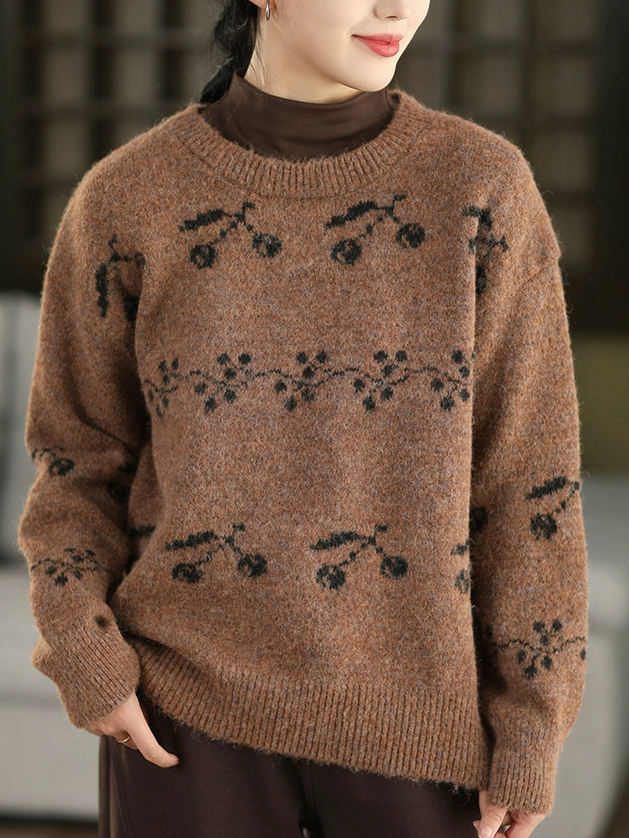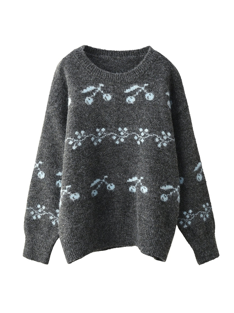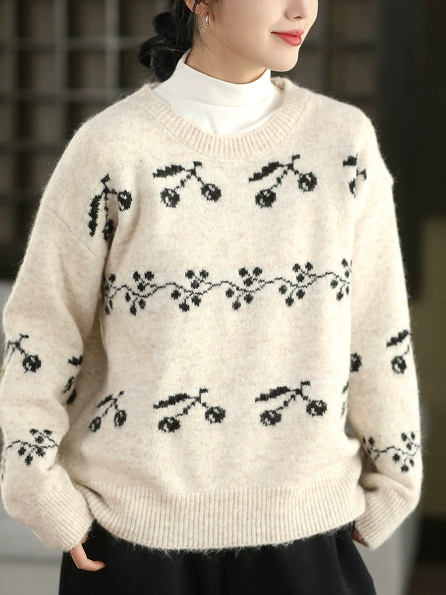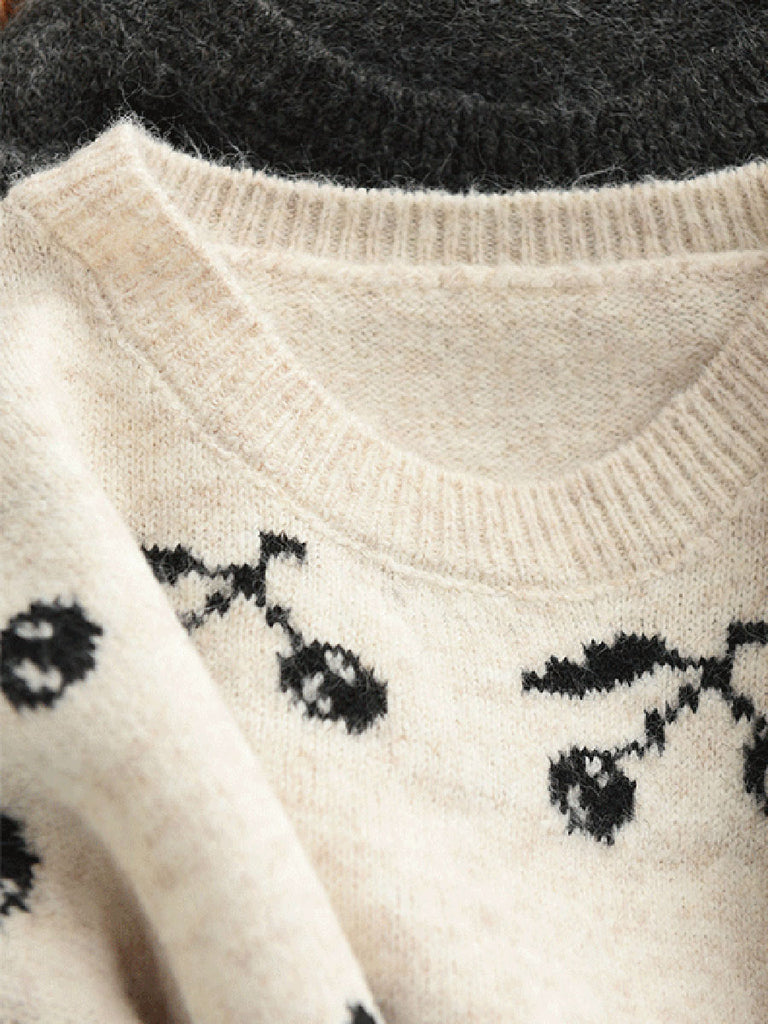 Maglione girocollo in jacquard con ciliegie artistiche autunnale da donna
