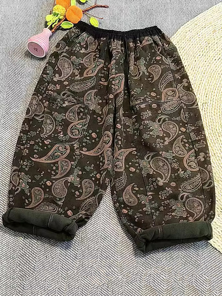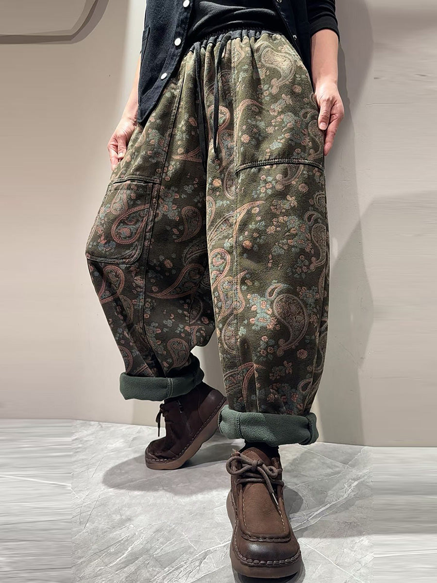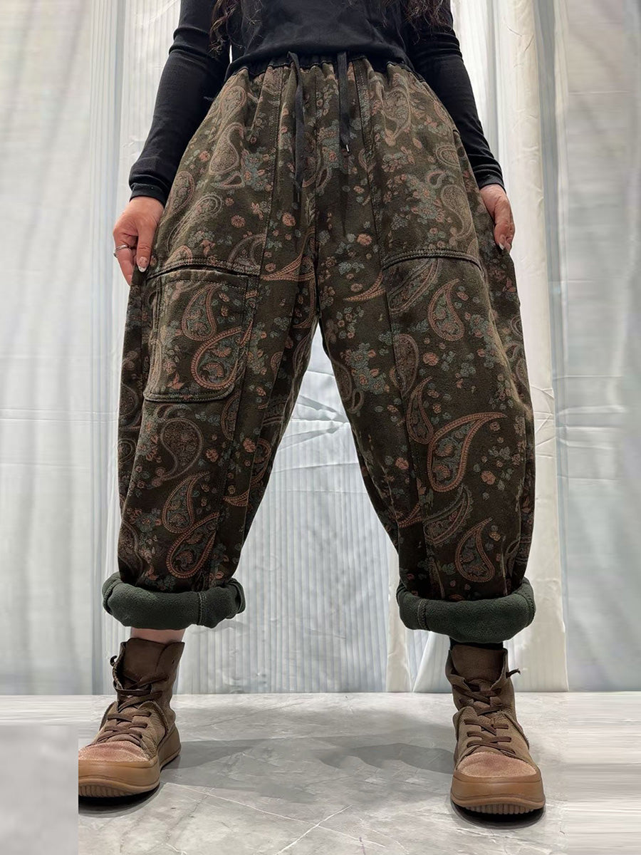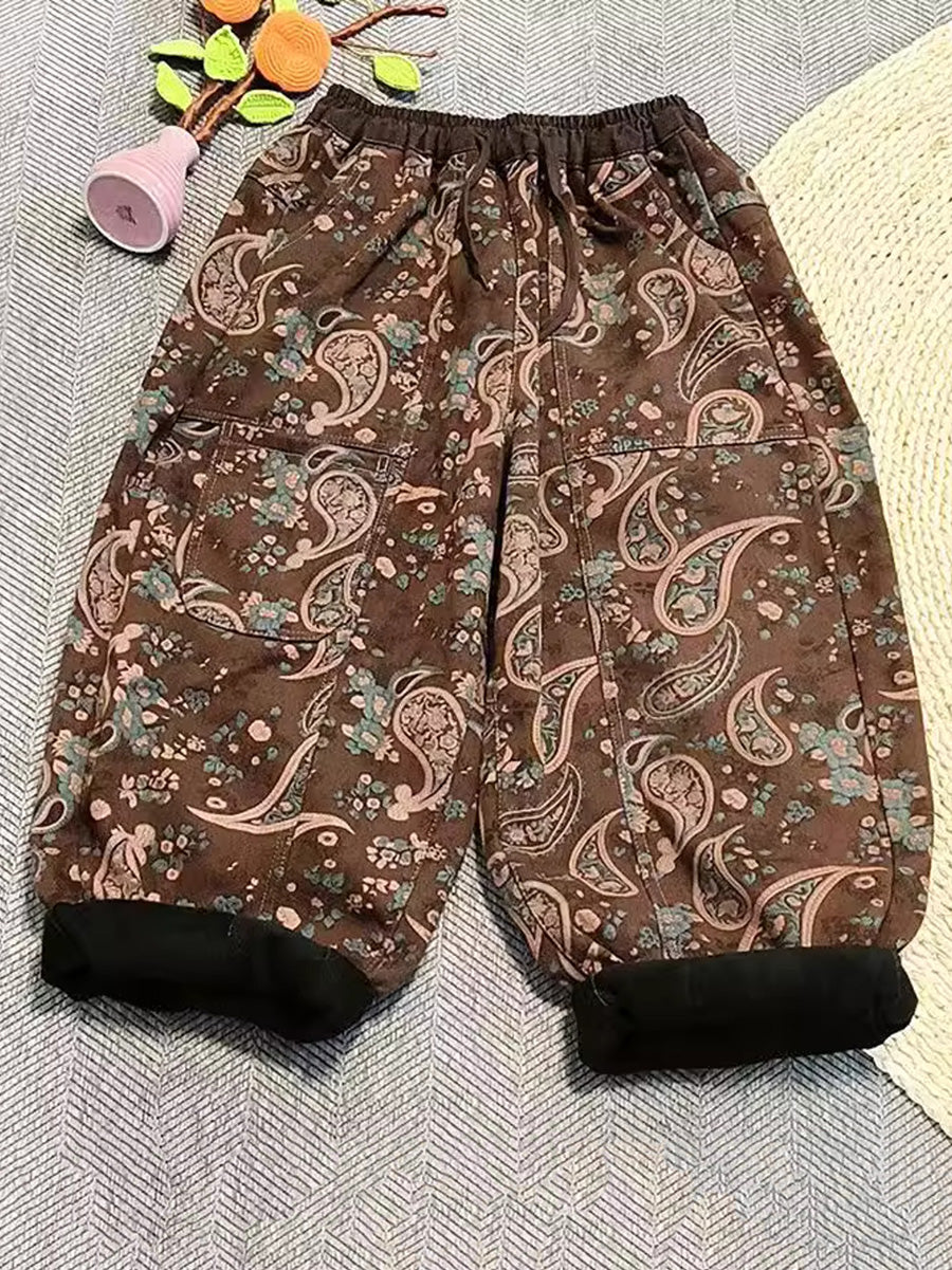 Pantaloni harem da donna con fodera in pile e motivo floreale vintage