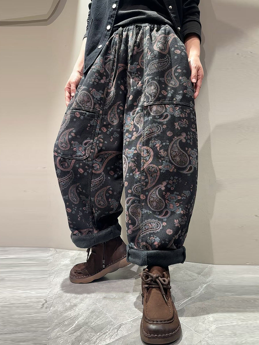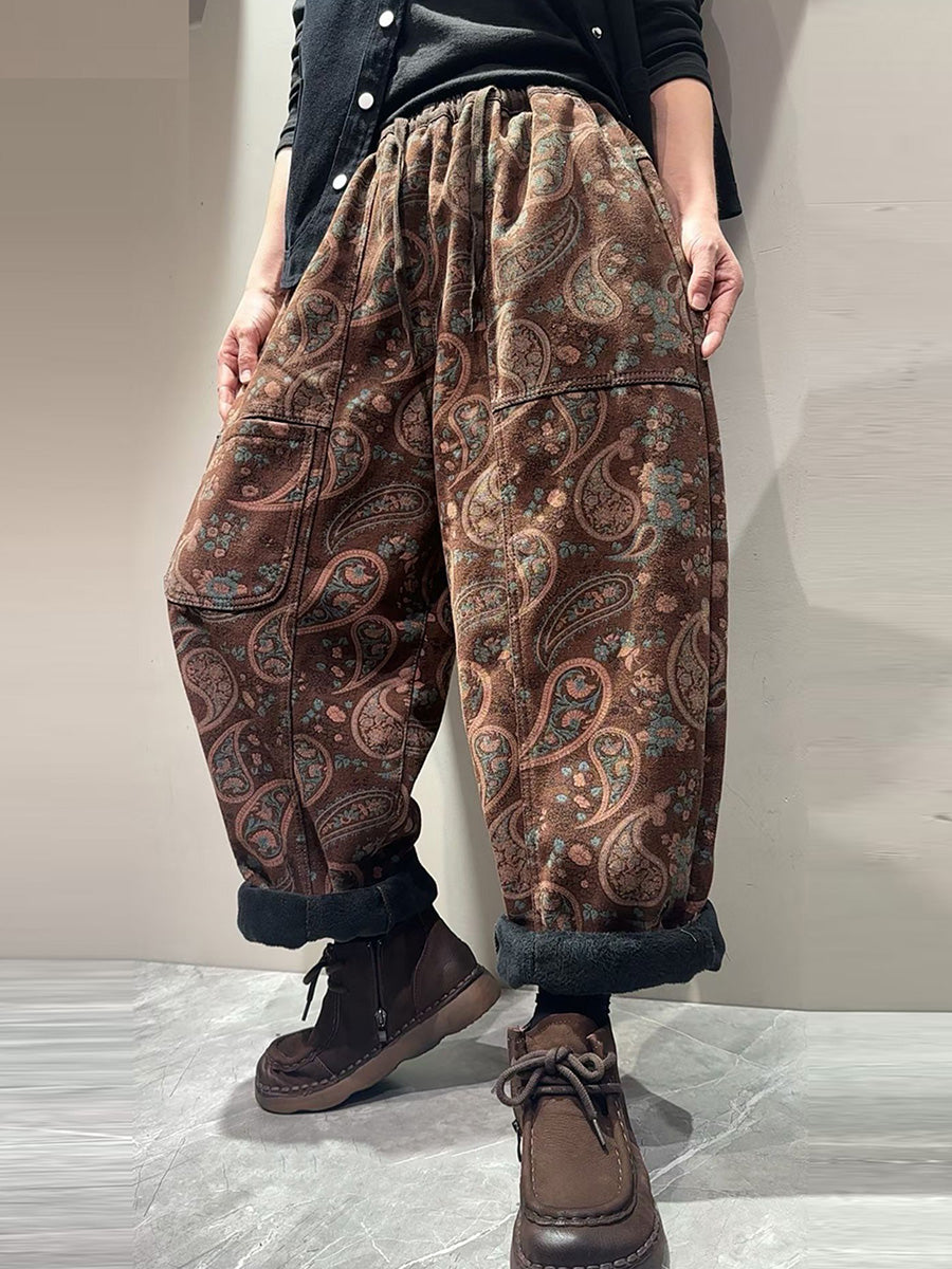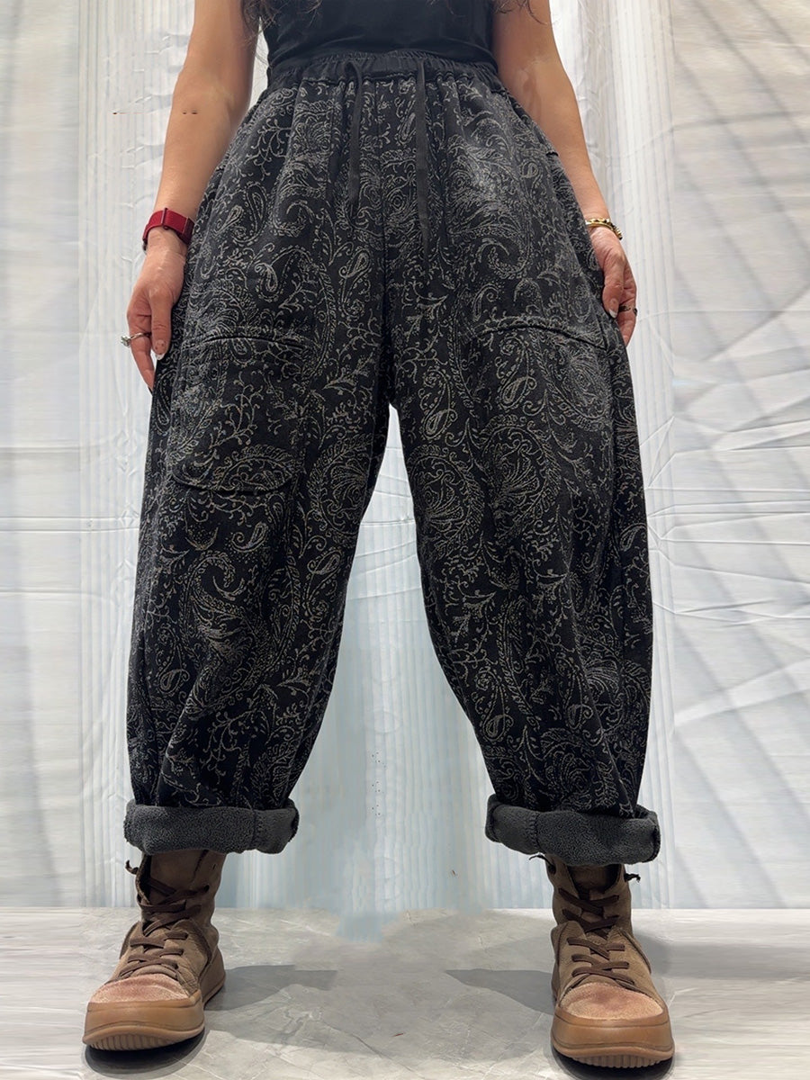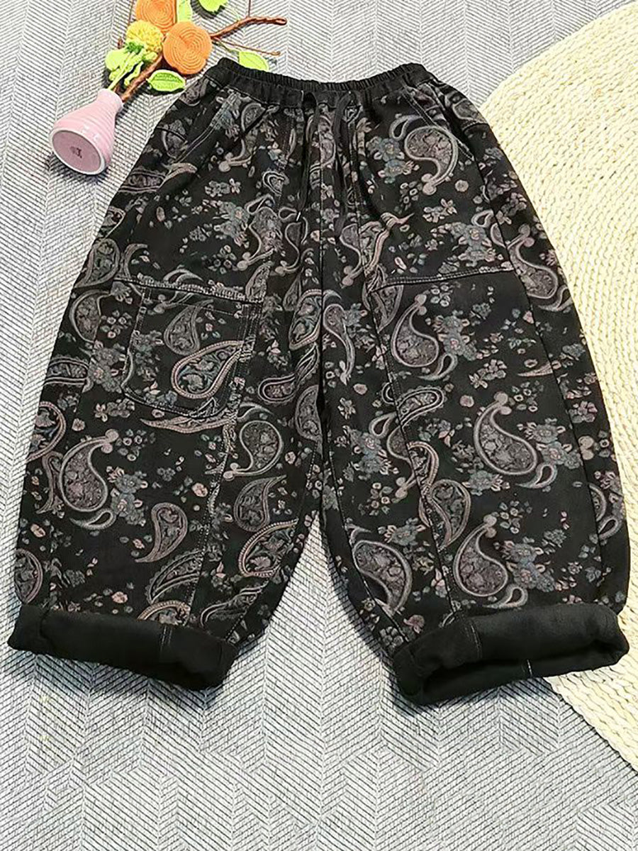Pantaloni harem da donna con fodera in pile e motivo floreale vintage