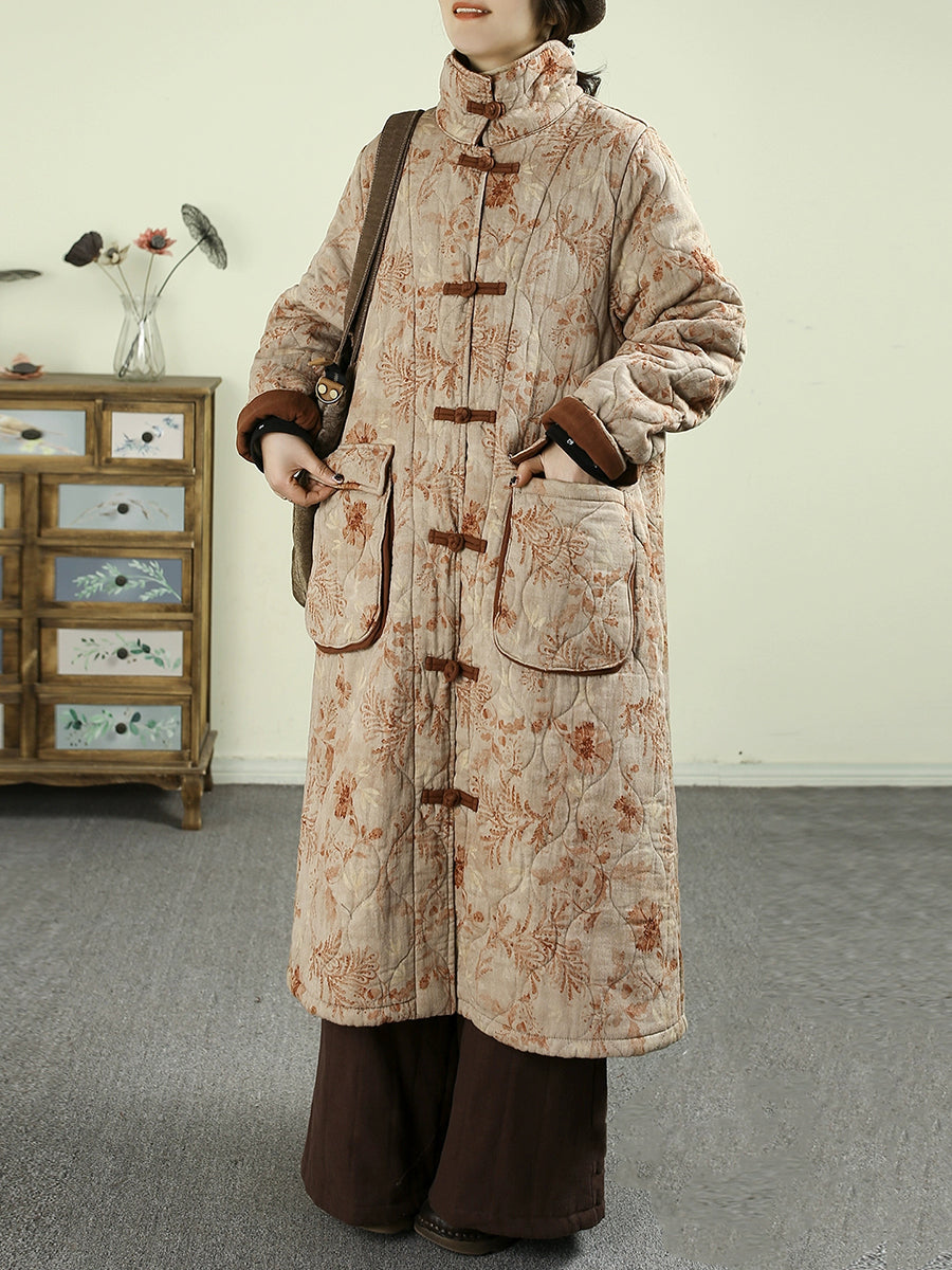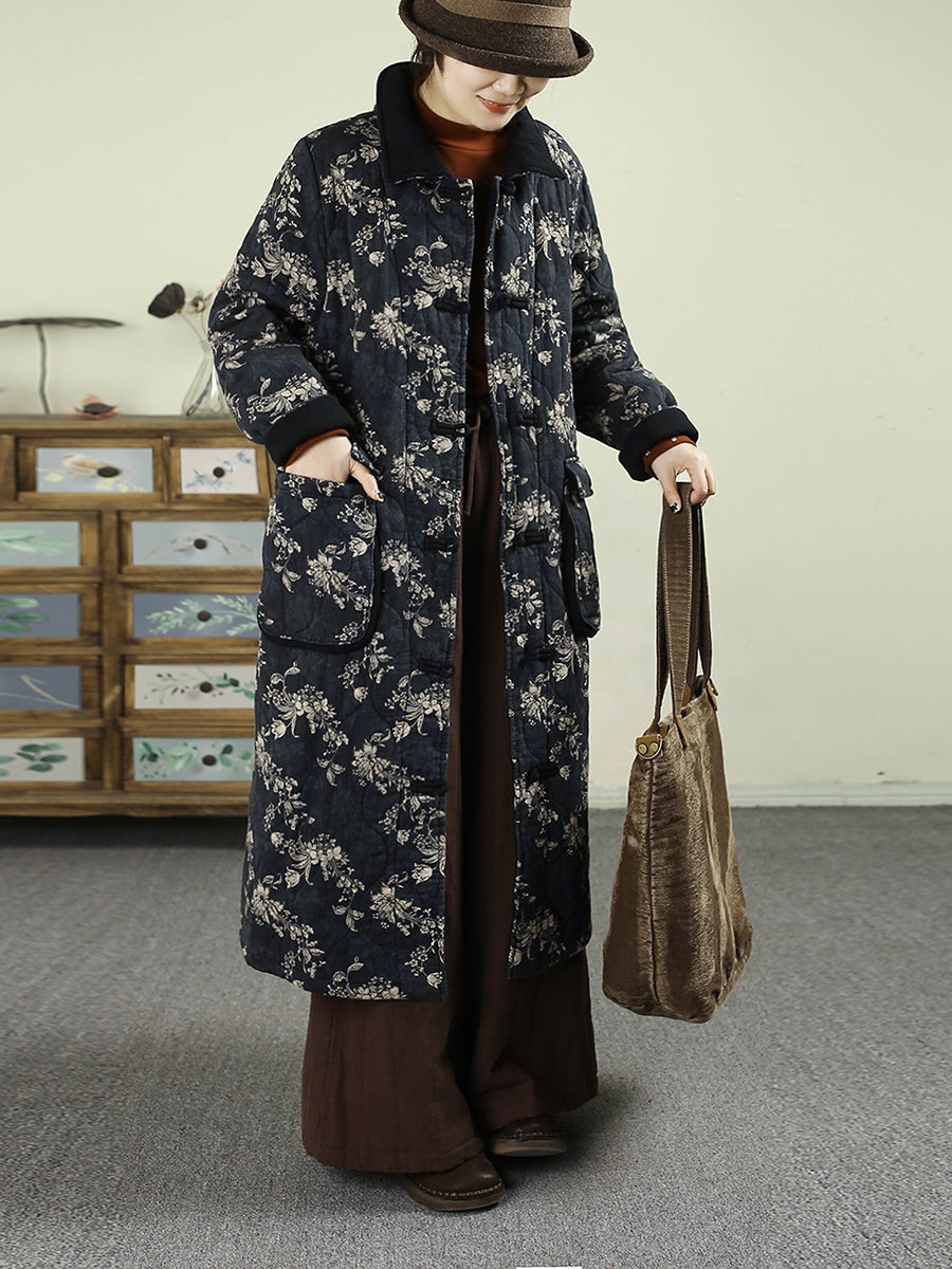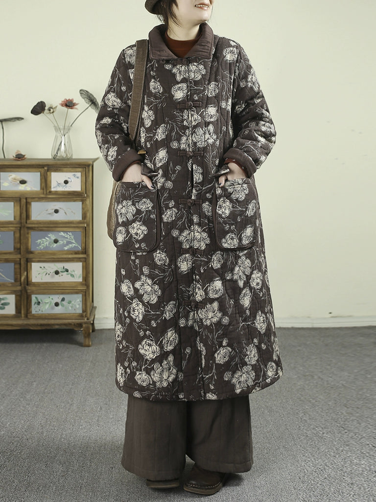 Cappotto invernale da donna con colletto rovesciato imbottito e motivo floreale retrò
