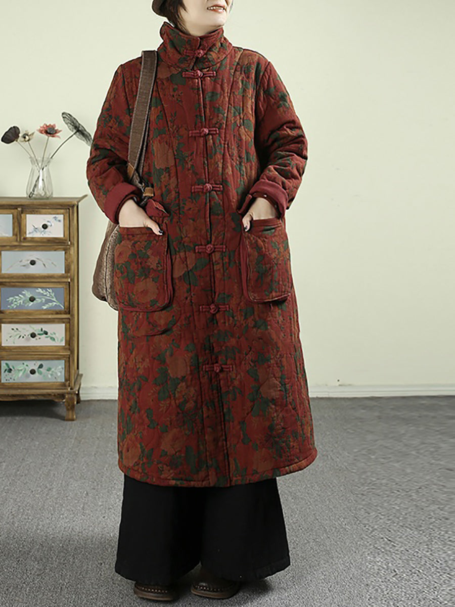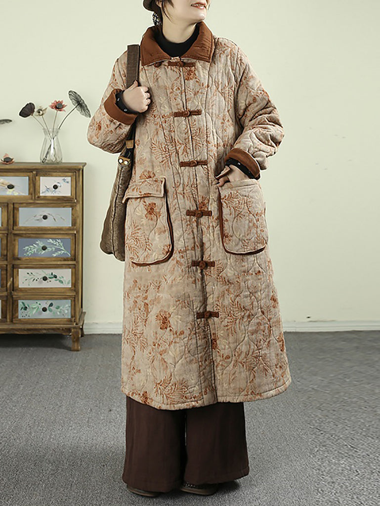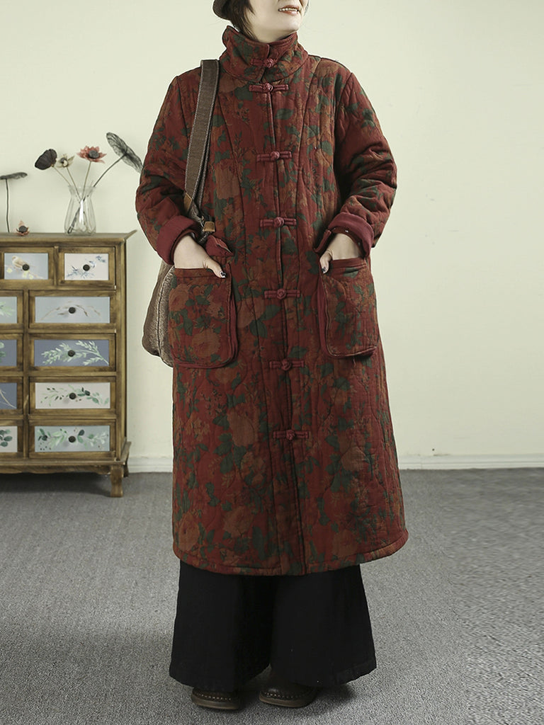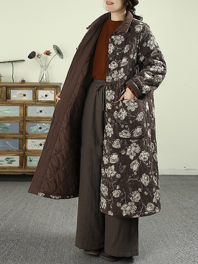 Cappotto invernale da donna con colletto rovesciato imbottito e motivo floreale retrò