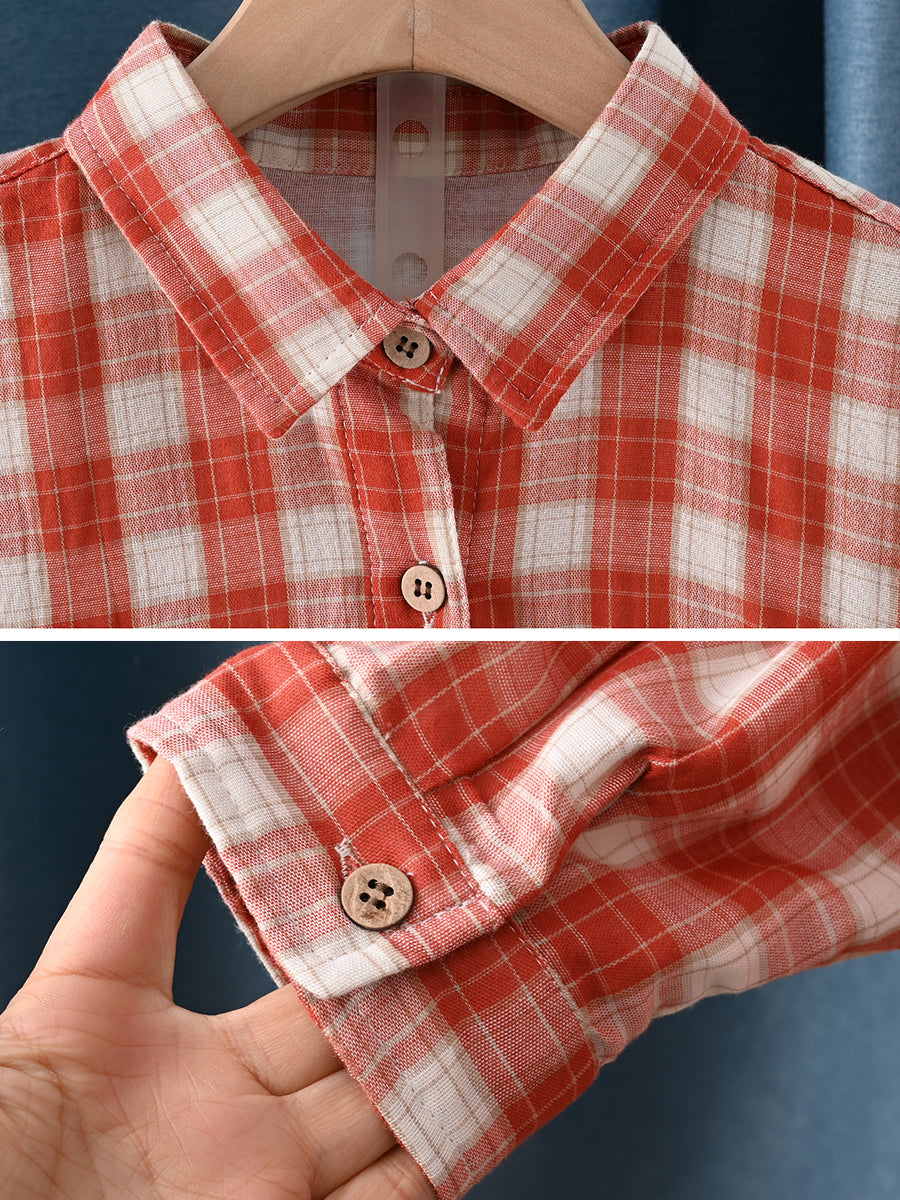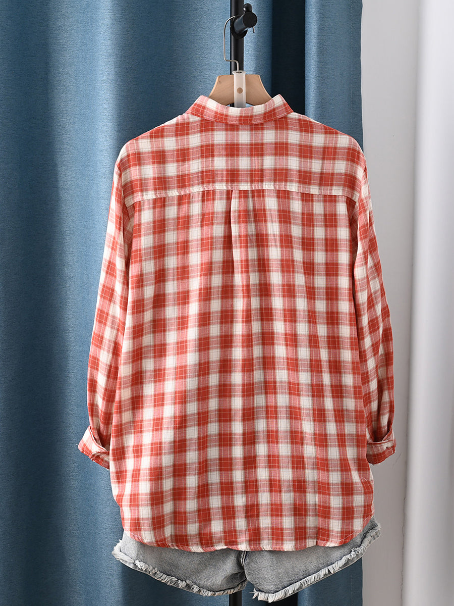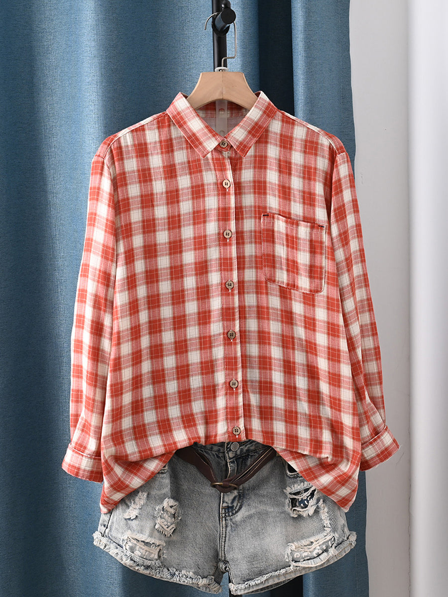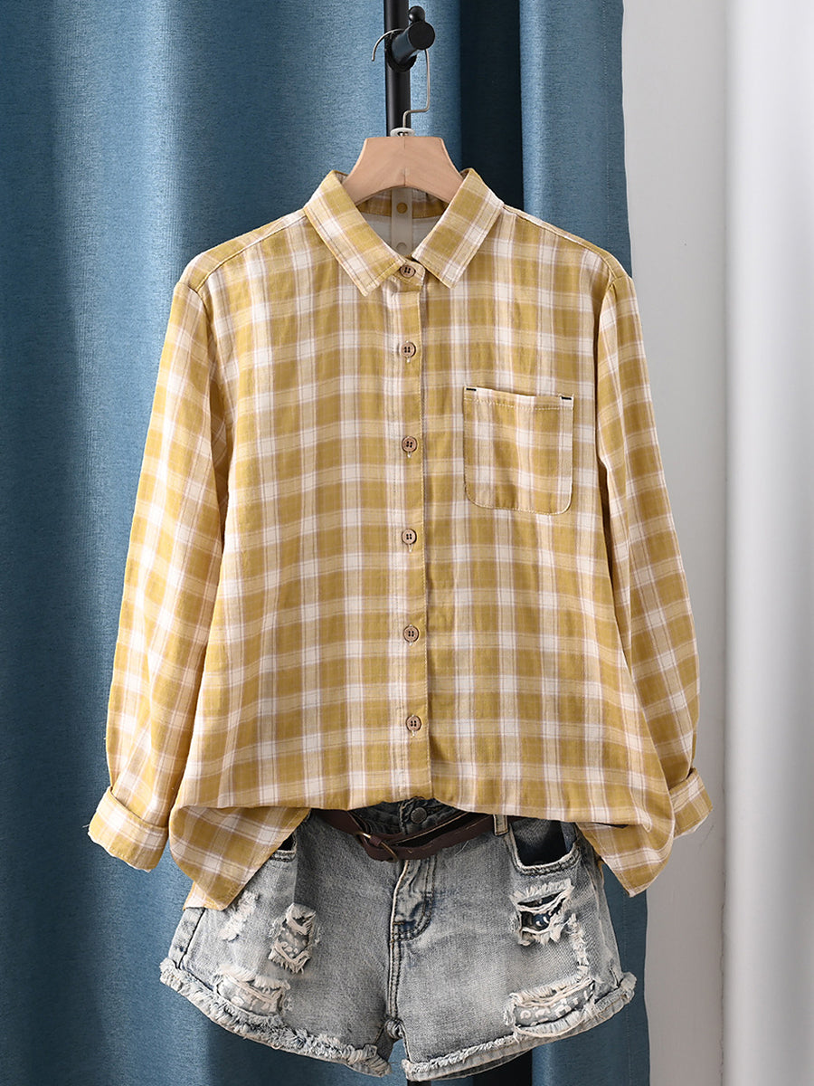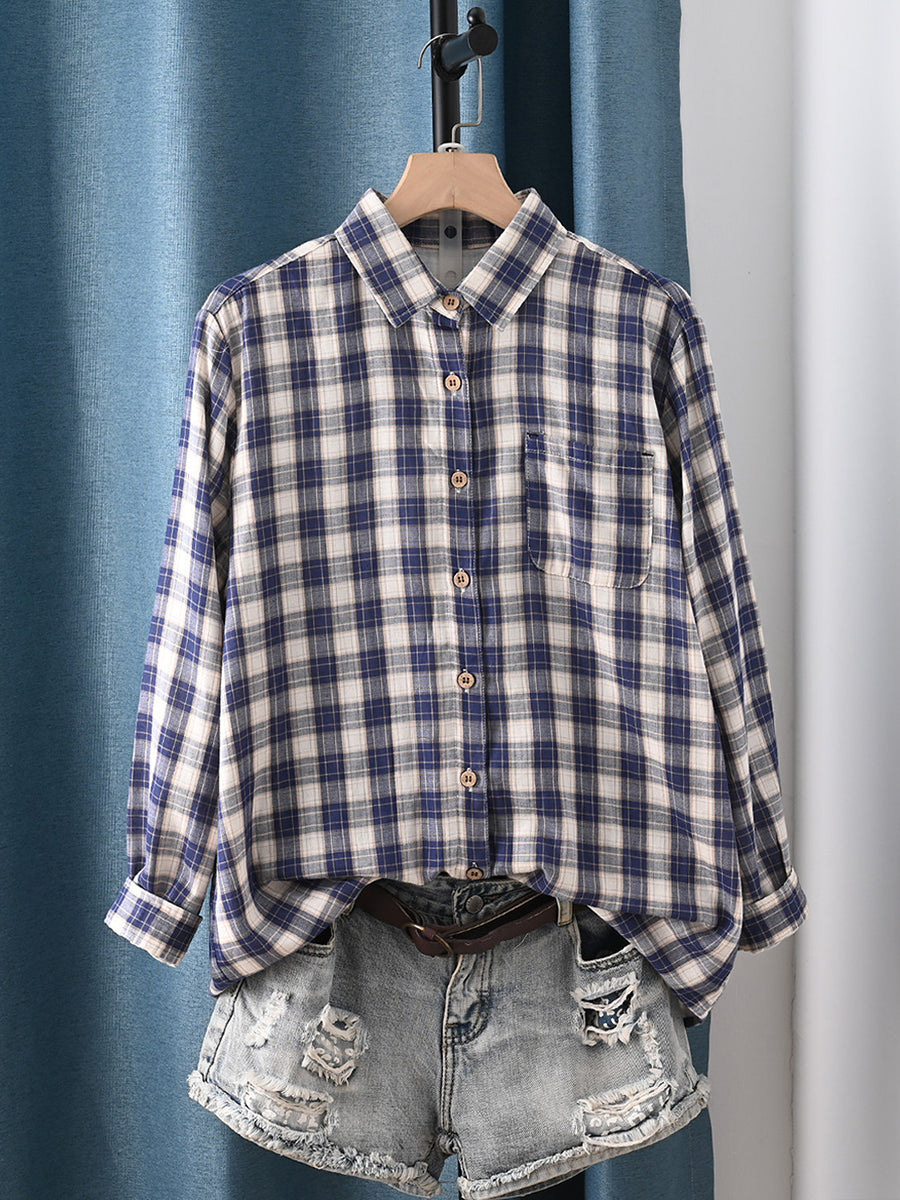 Camicia da donna primaverile in 100% cotone con colletto rovesciato e motivo scozzese artistico