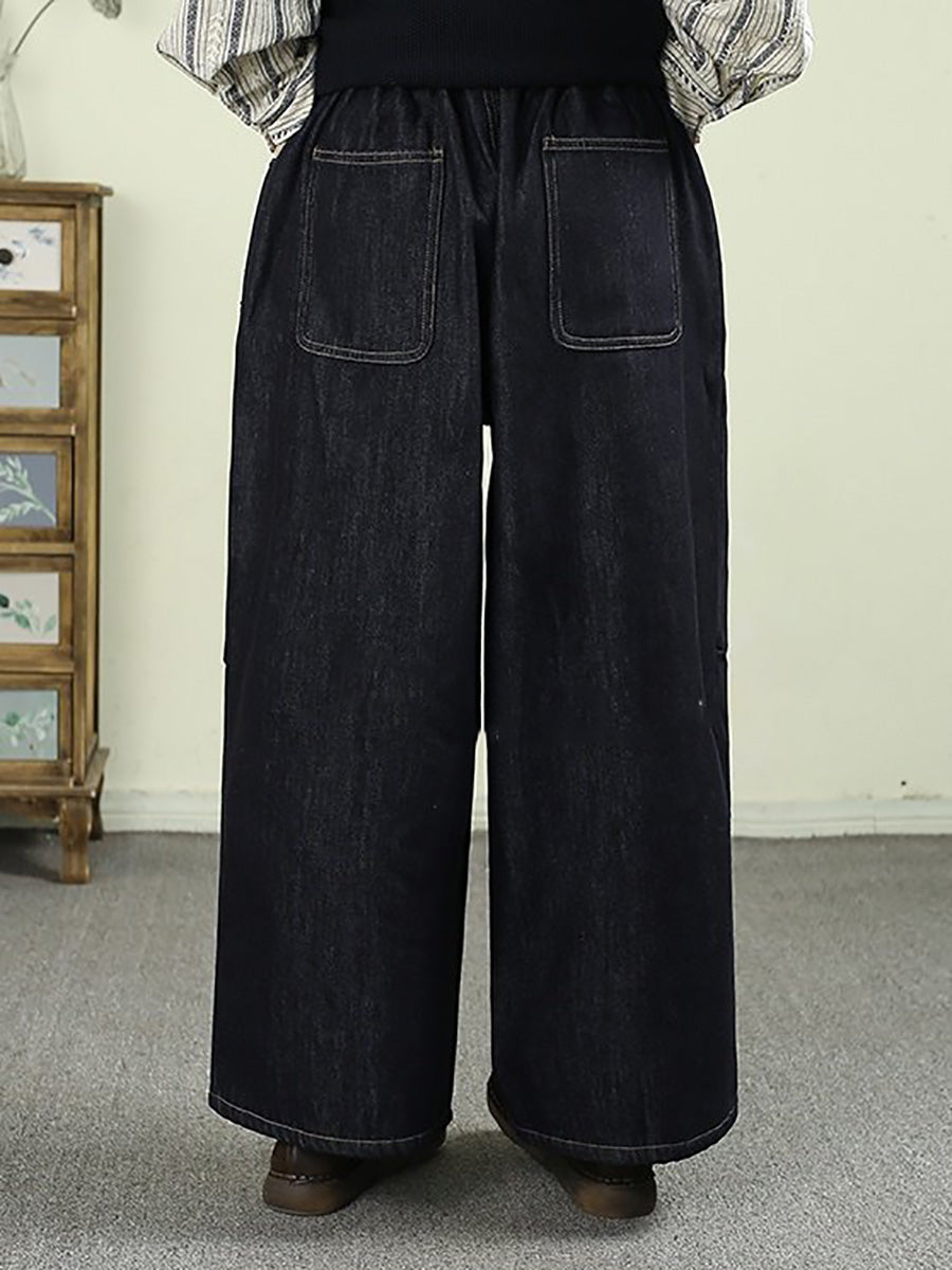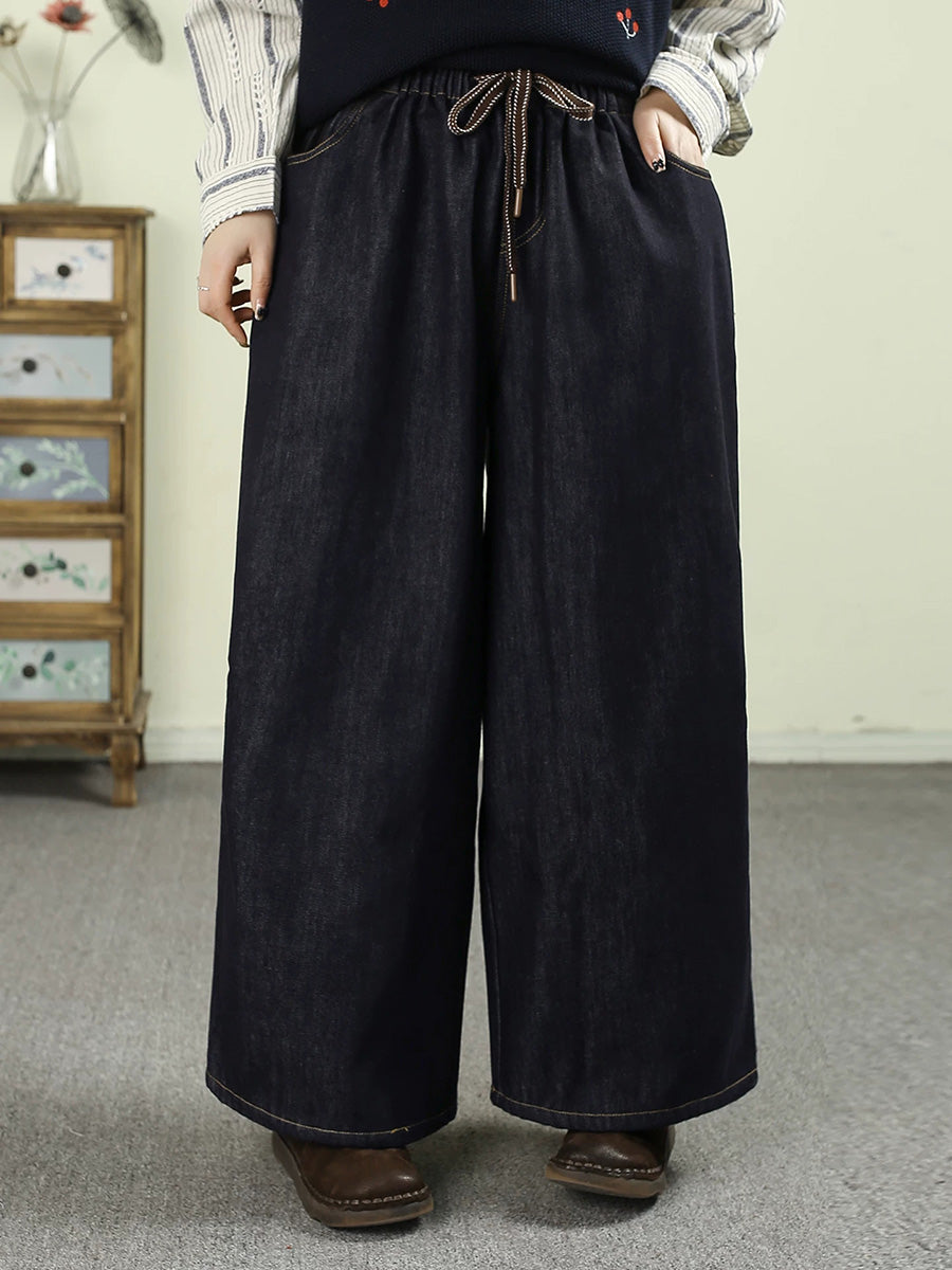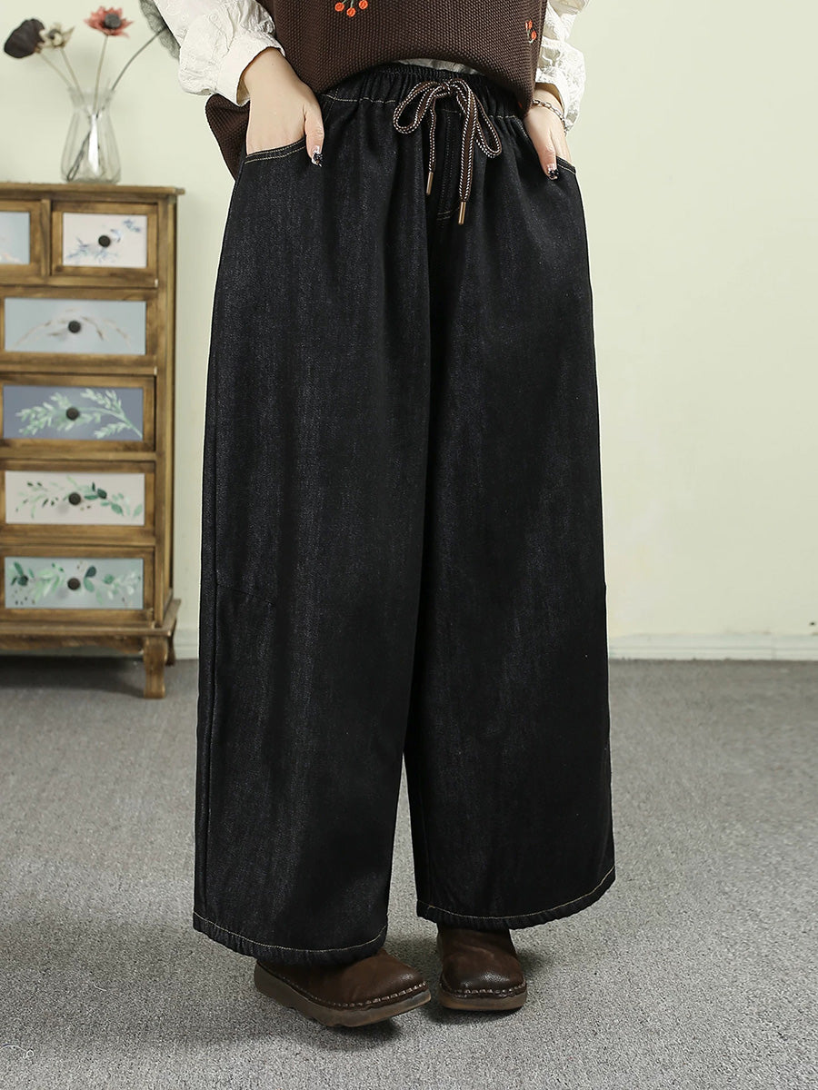 Pantaloni a gamba larga foderati in pile in denim retrò invernale da donna