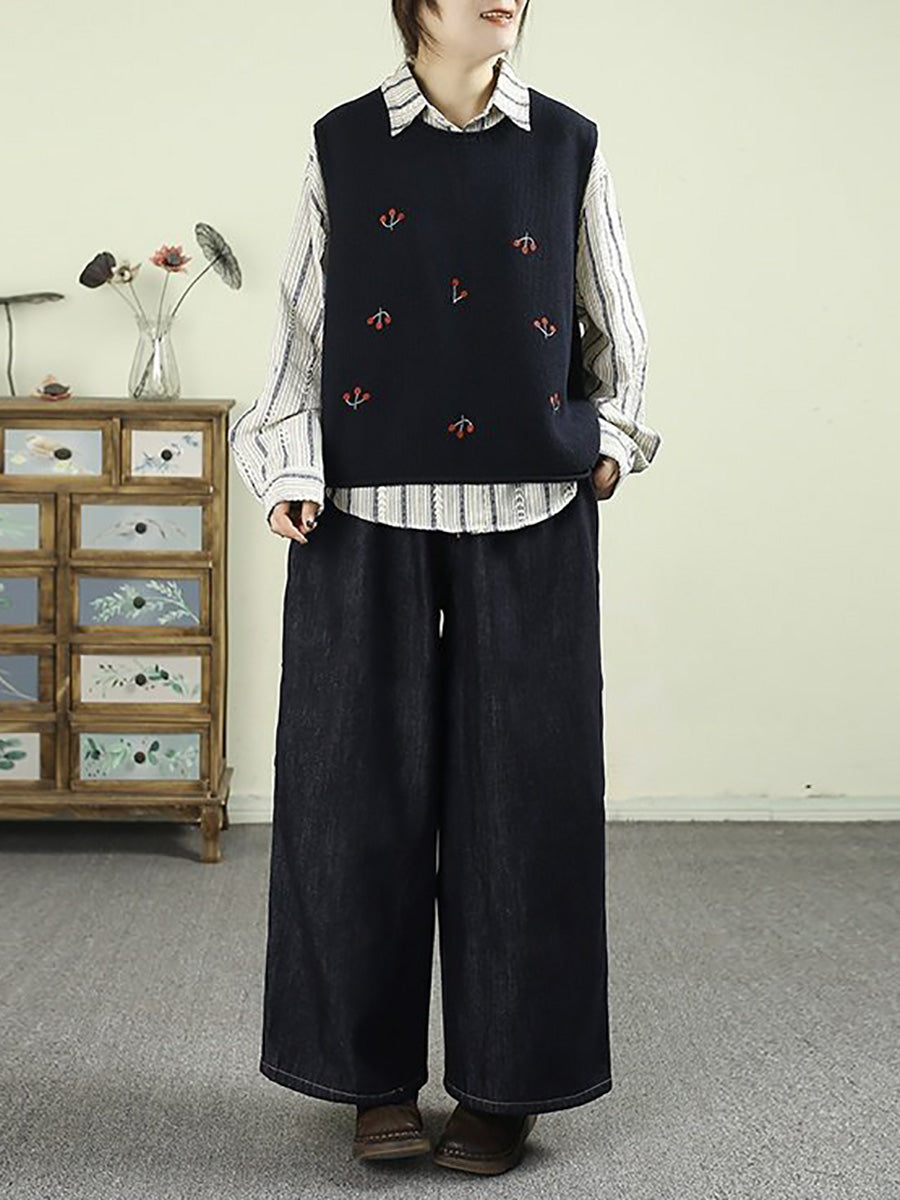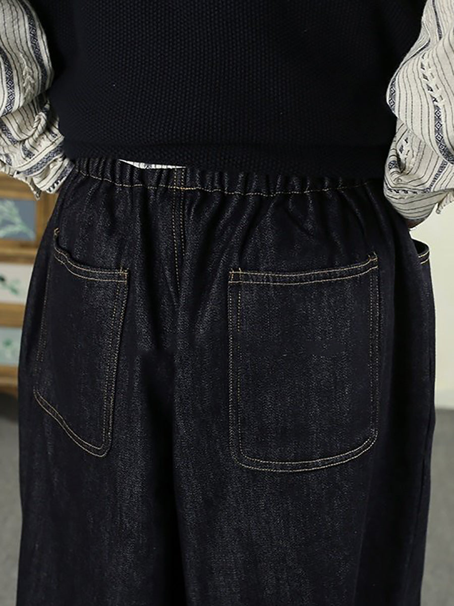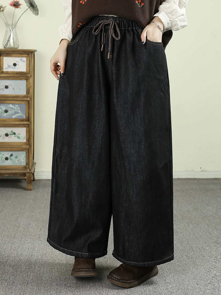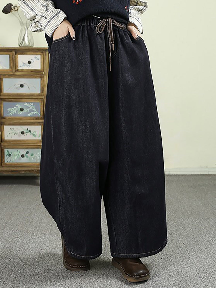 Pantaloni a gamba larga foderati in pile in denim retrò invernale da donna