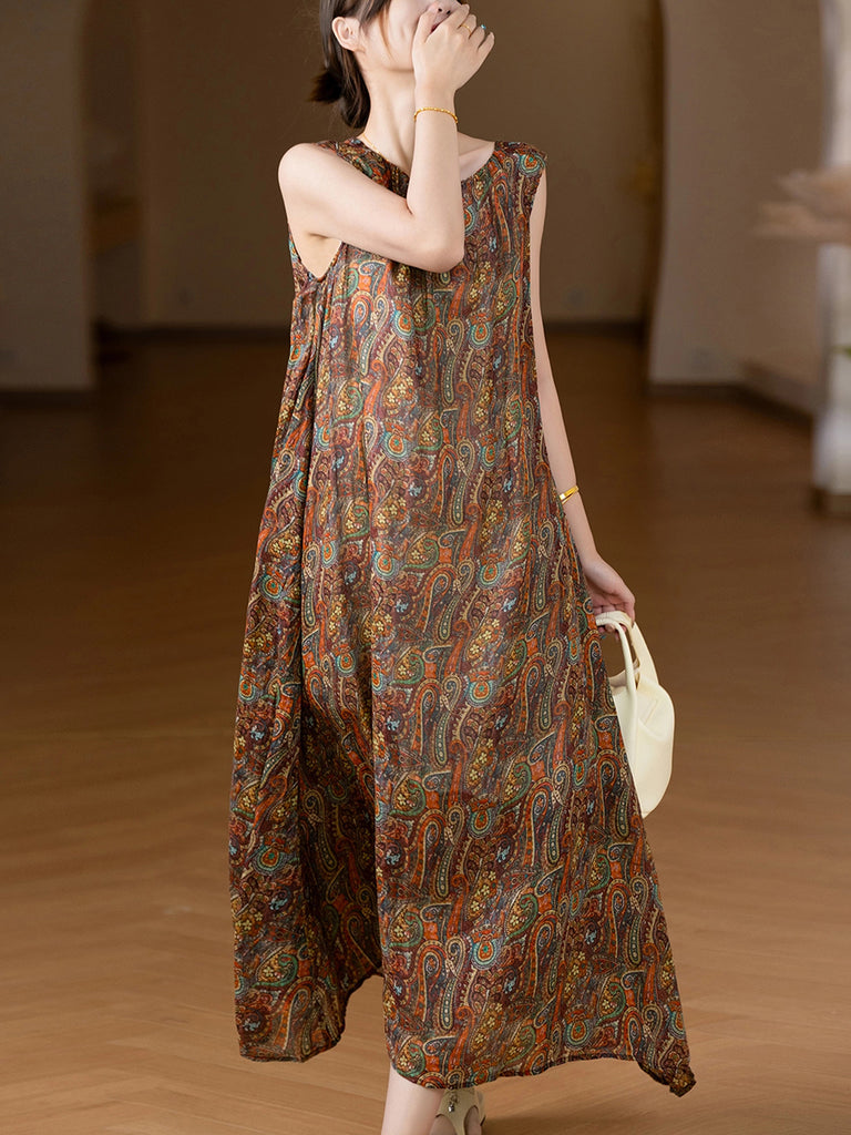 Abito da donna in ramie con scollo a V e stampa retrò estiva