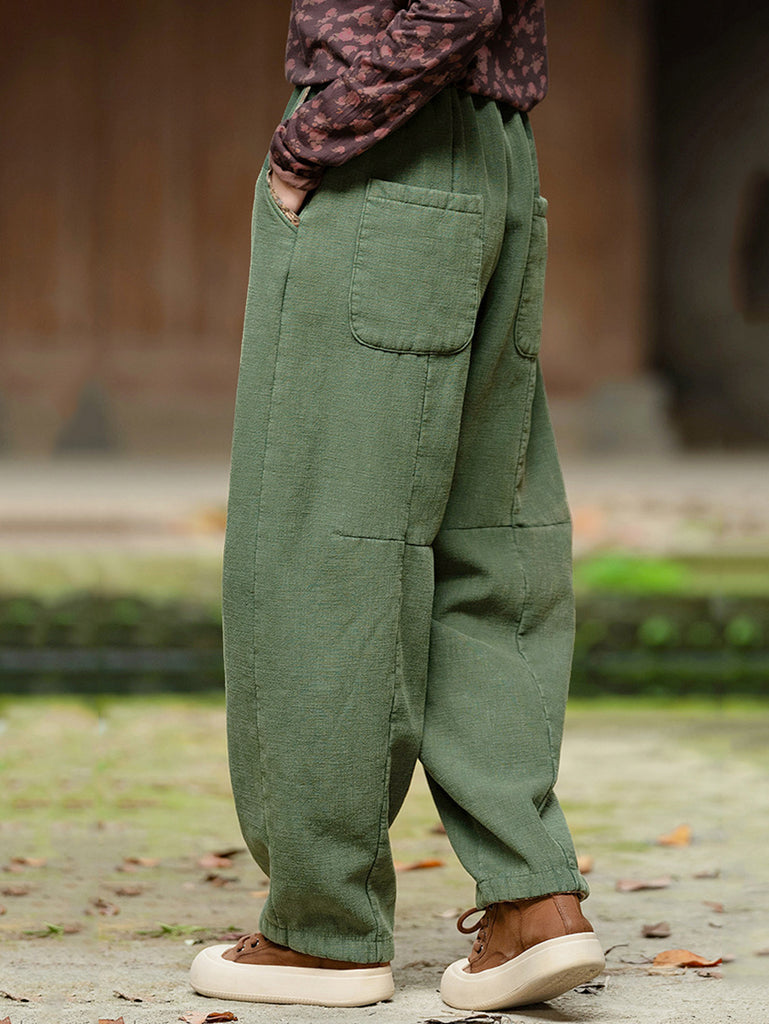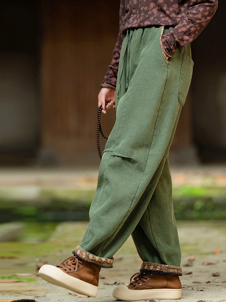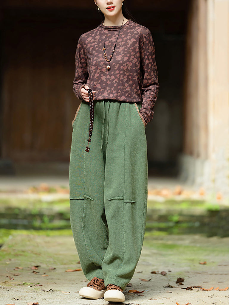 Pantaloni a gamba larga in cotone e lino con fiori retrò invernali da donna