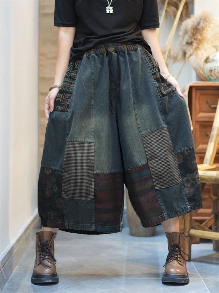 Pantaloni harem in denim con patchwork floreale retrò da donna