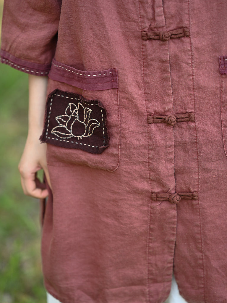 Camicia da donna estiva retrò con toppa di loto e colletto alto in lino 100%