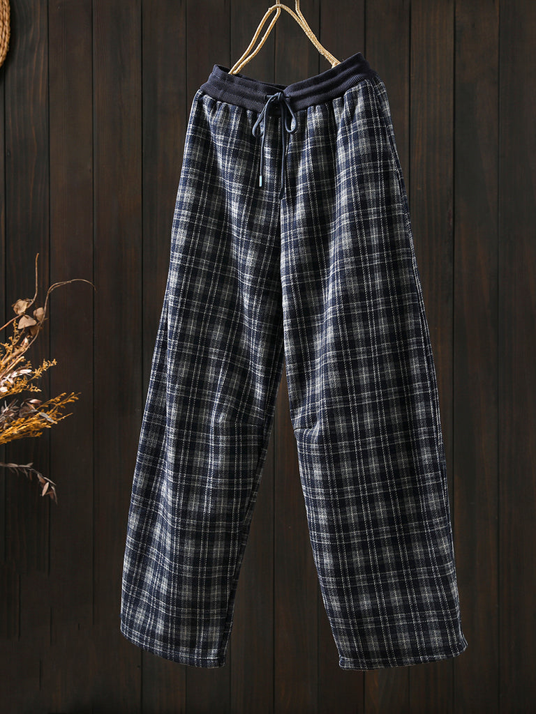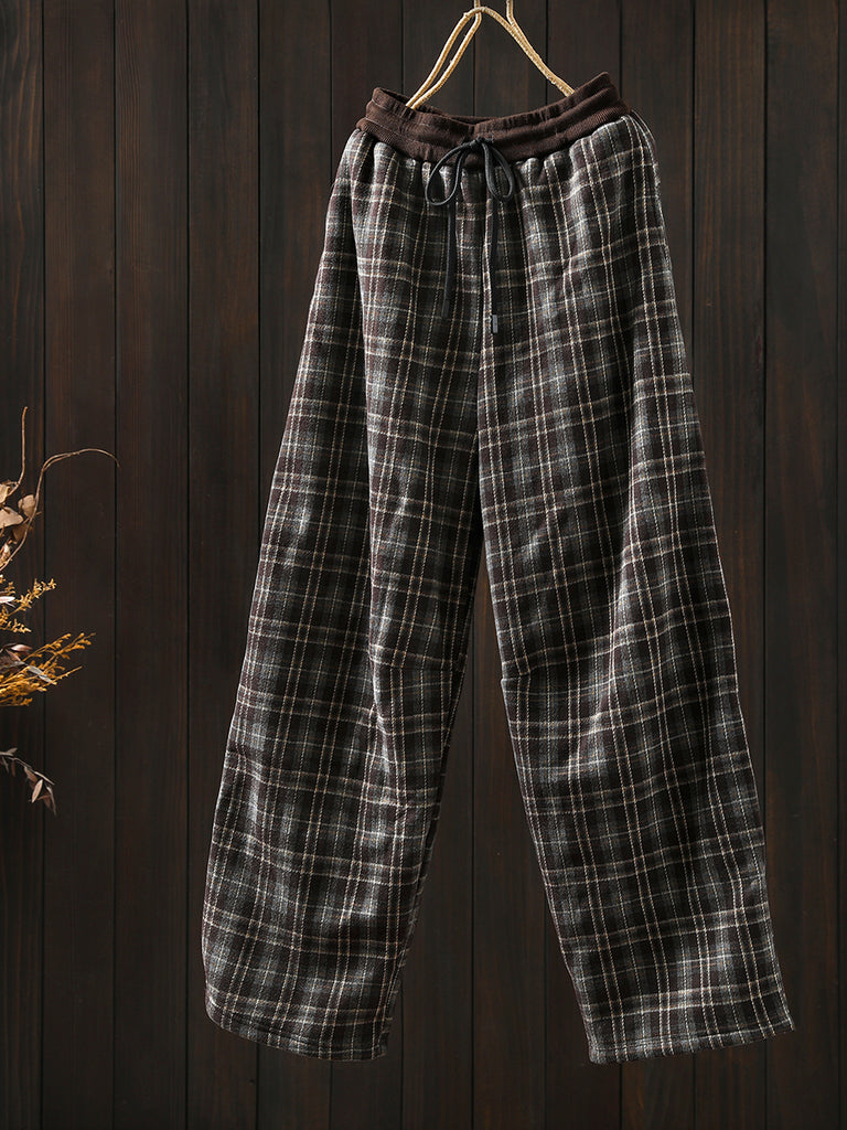 Pantaloni a gamba larga foderati in pile a quadri retrò invernali da donna