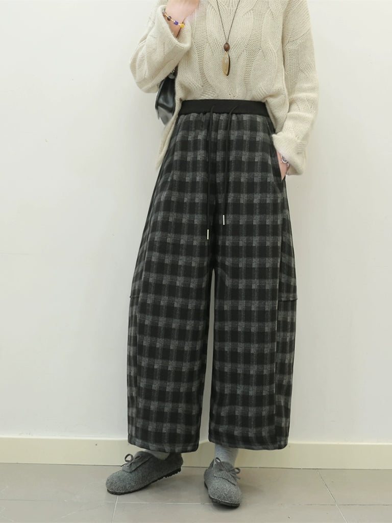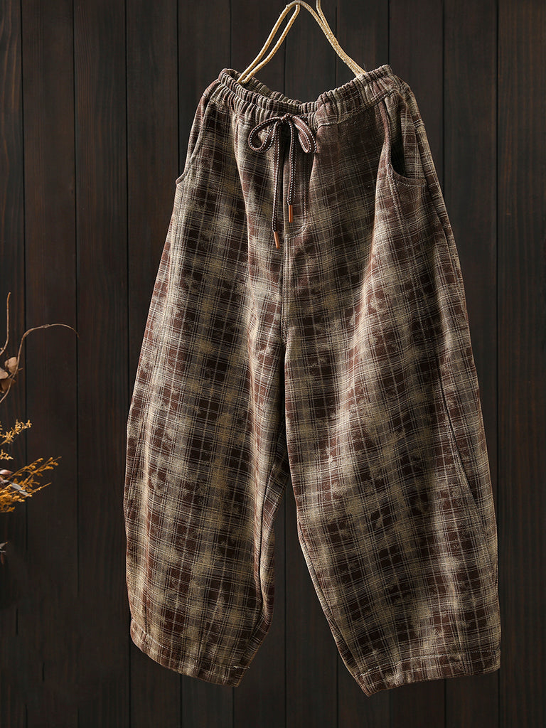 Pantaloni harem invernali da donna con fodera in pile a quadri retrò