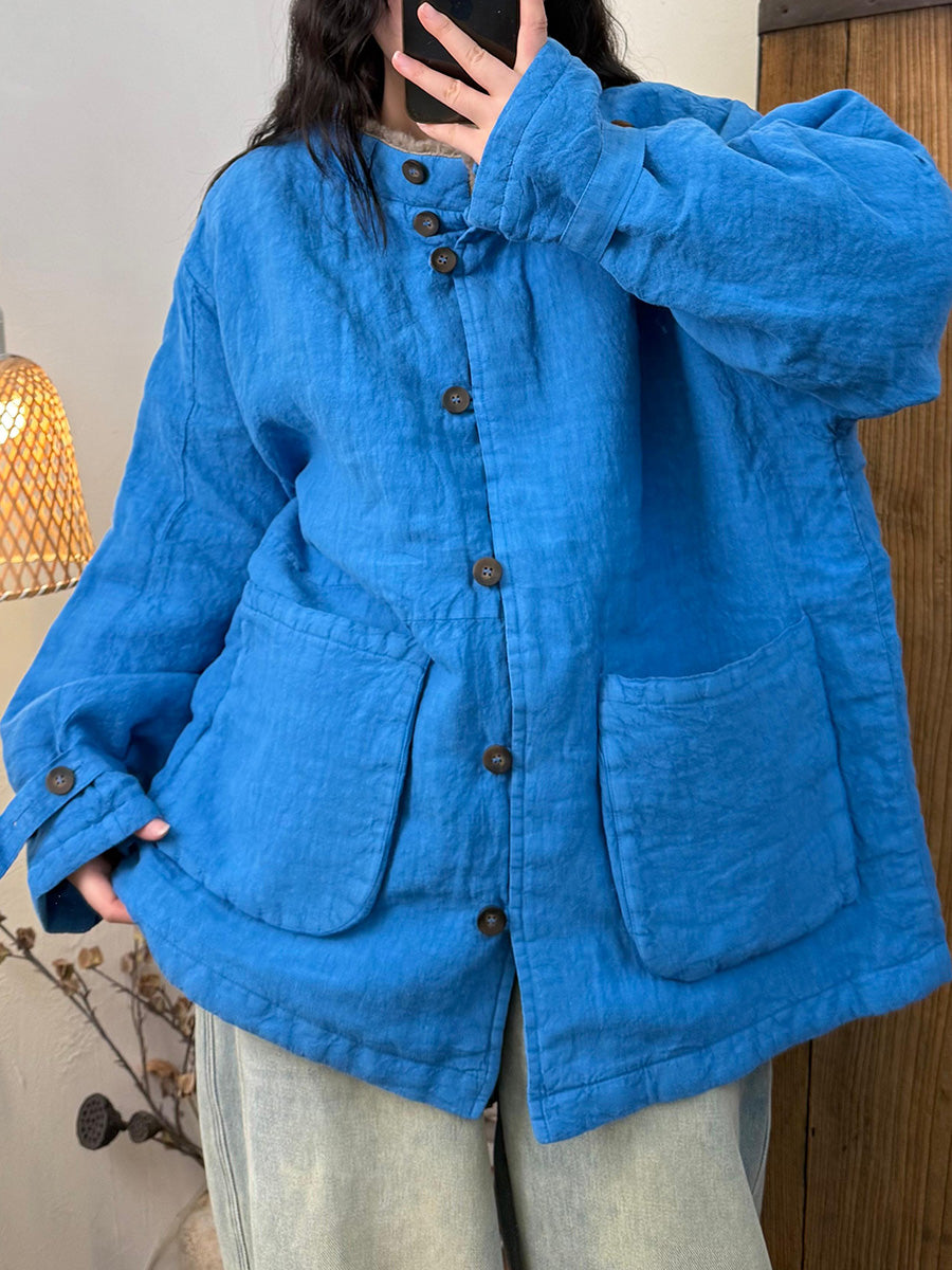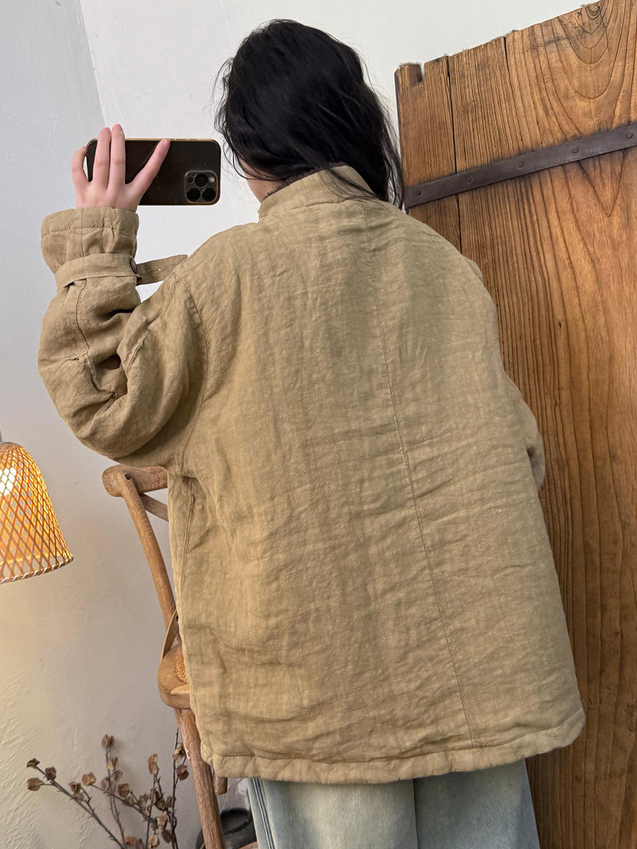 Cappotto invernale vintage da donna in pile di lino con collo alto