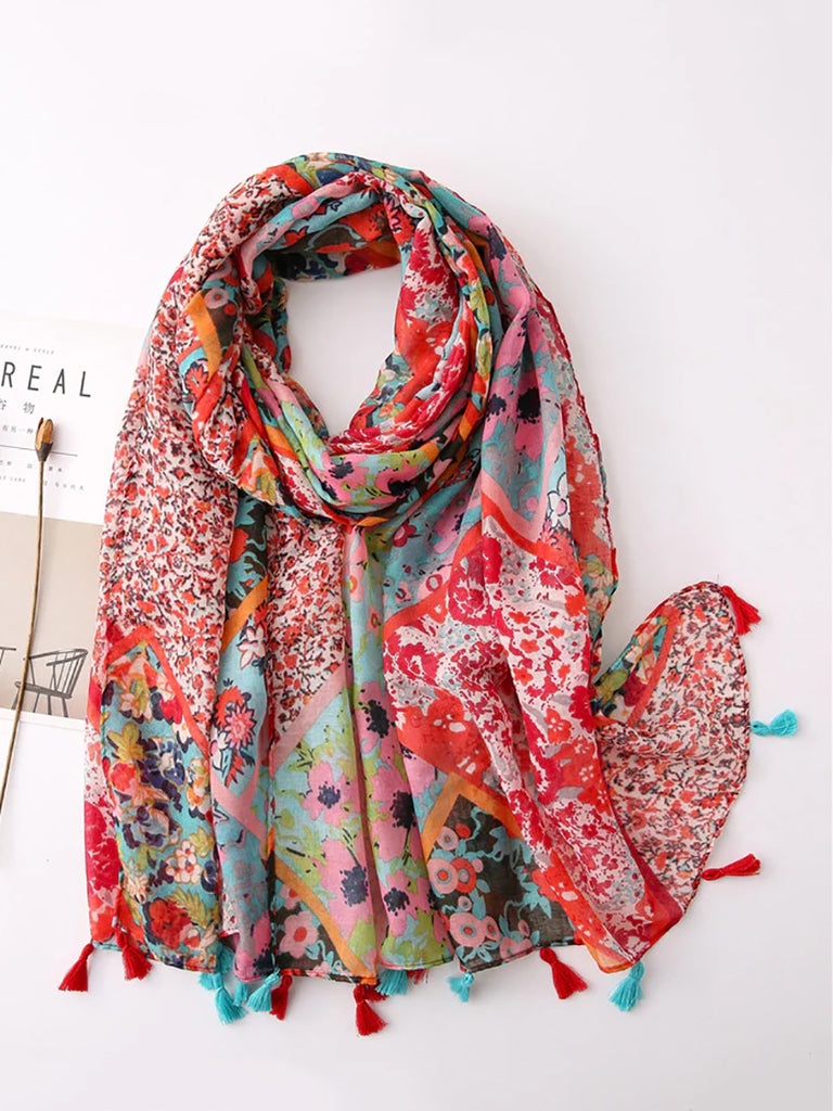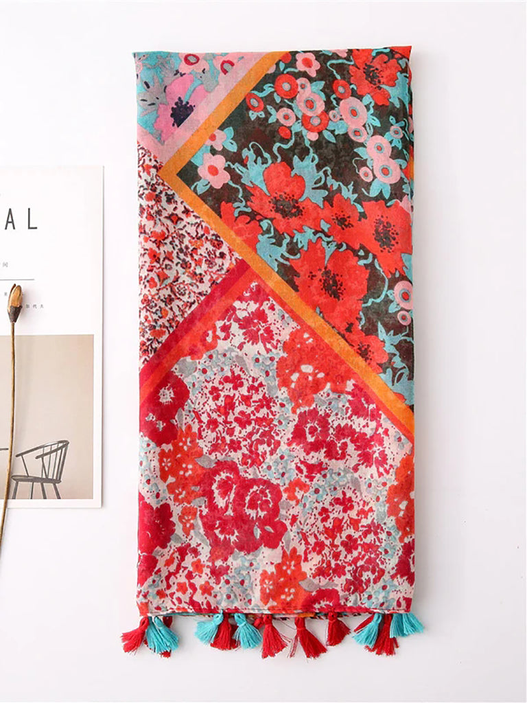 Sciarpa scialle da viaggio con nappa e stampa floreale etnica