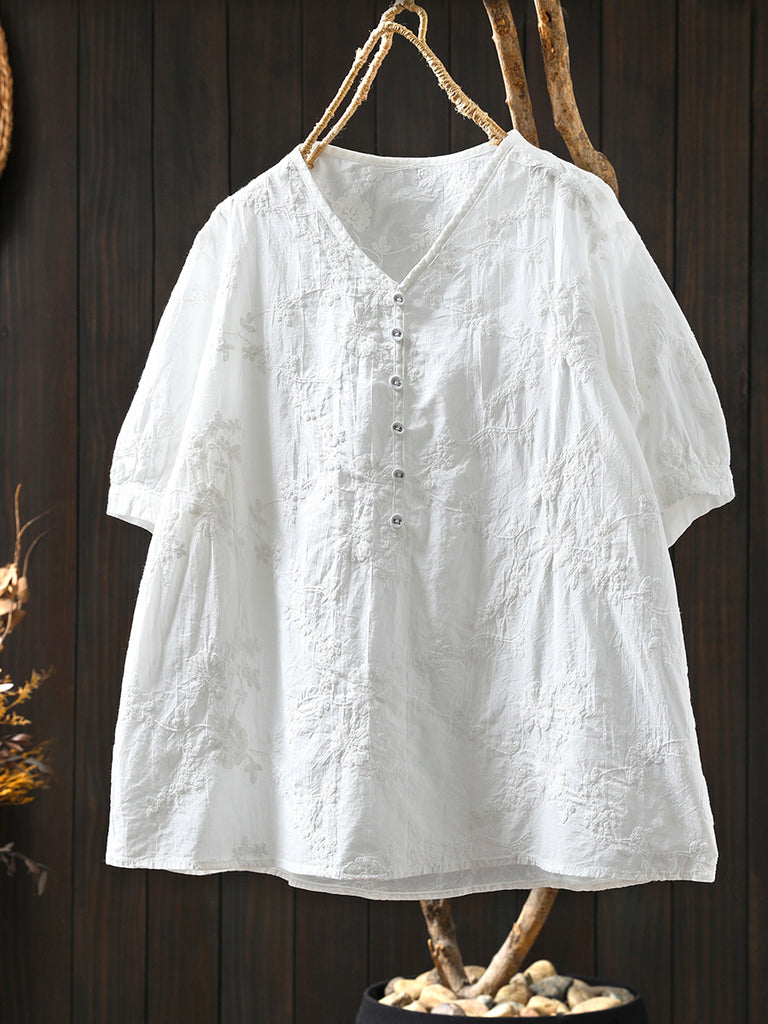 Camicia da donna con scollo a V e ricamo artistico, 100% cotone