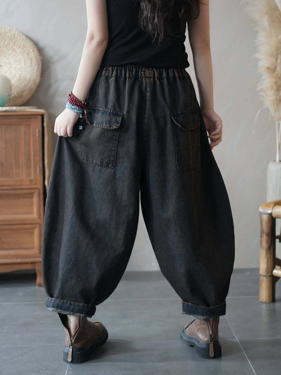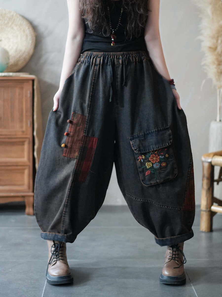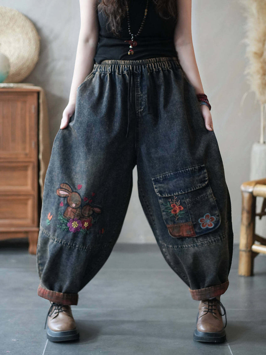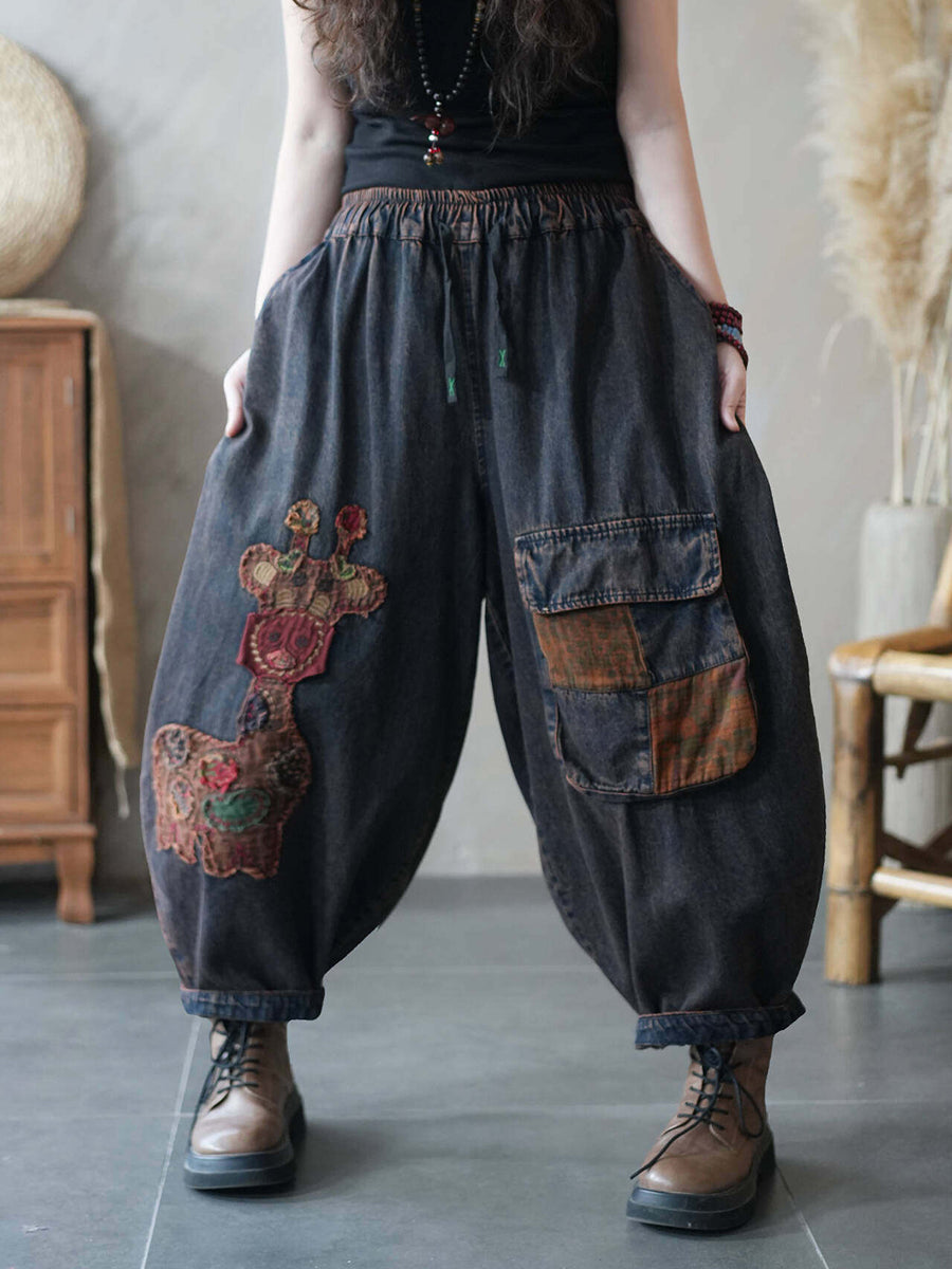 Pantaloni harem in denim da donna estivi con applicazioni di giraffa