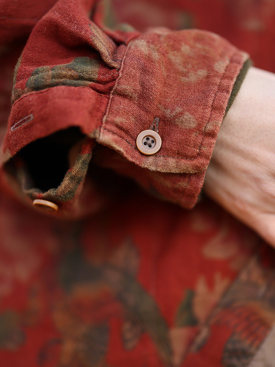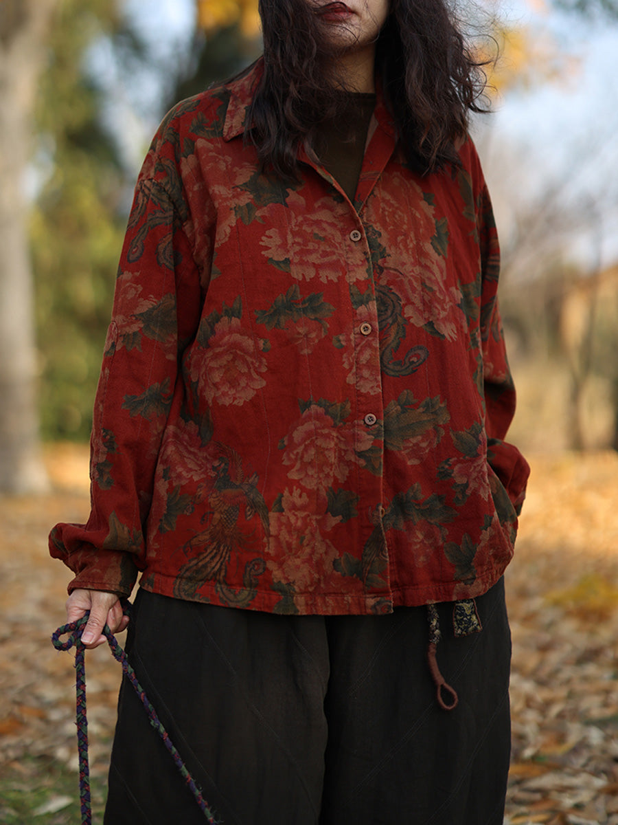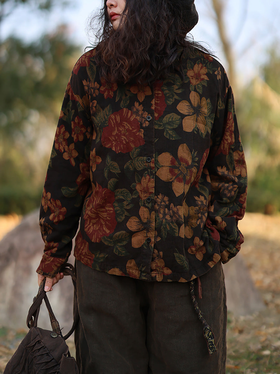 Camicia da donna vintage autunnale con colletto rovesciato e motivo floreale, 100% cotone