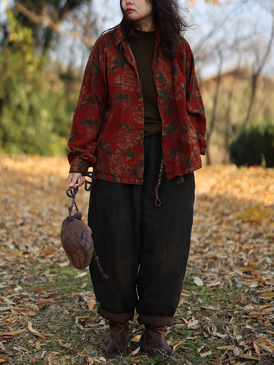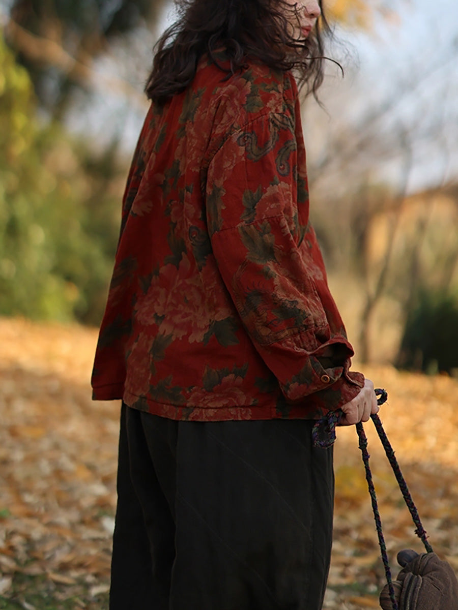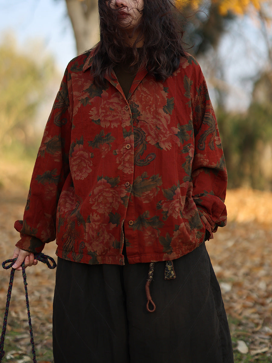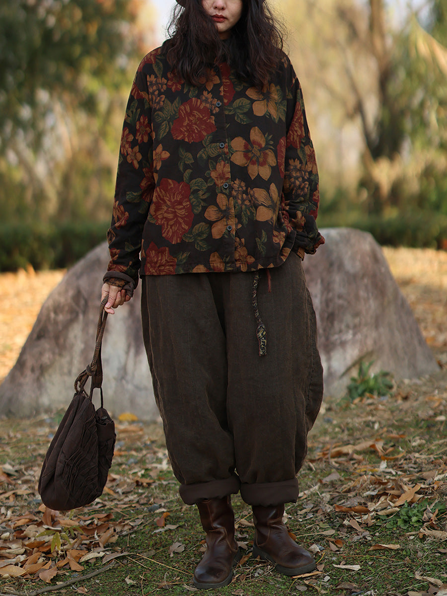 Camicia da donna vintage autunnale con colletto rovesciato e motivo floreale, 100% cotone