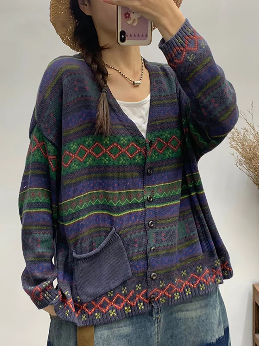 Maglione con scollo a V lavorato a maglia geometrica autunnale da donna