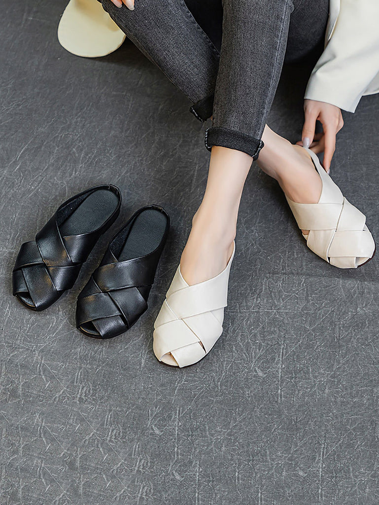 Pantofole estive da donna in morbida pelle con tacco basso e intreccio