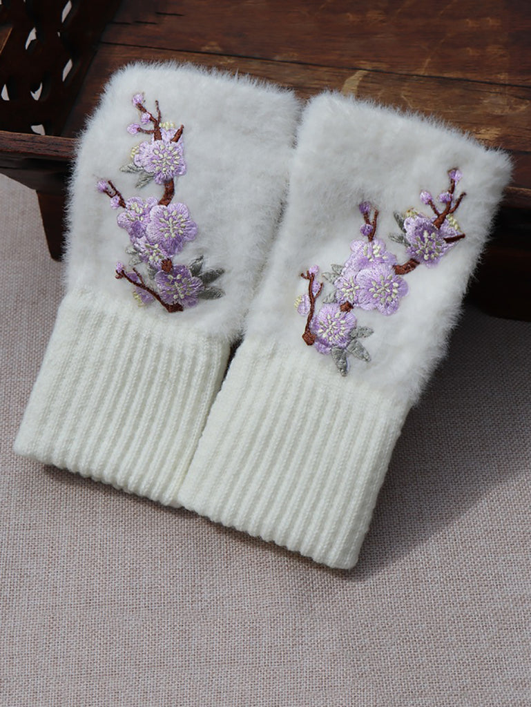 Women Artsy Winter Flower Embroidery Fleece Gloves