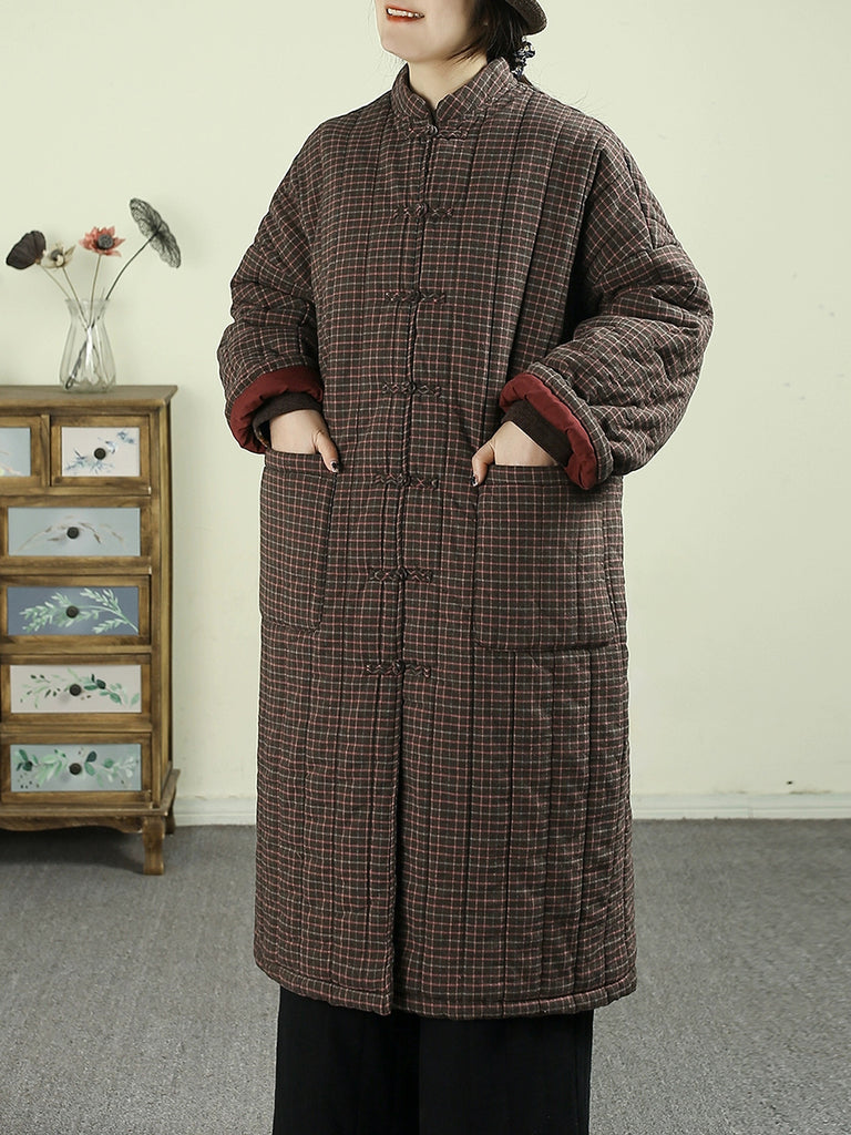 Women Winter Retro Plaid Stand Collar Padded Coat