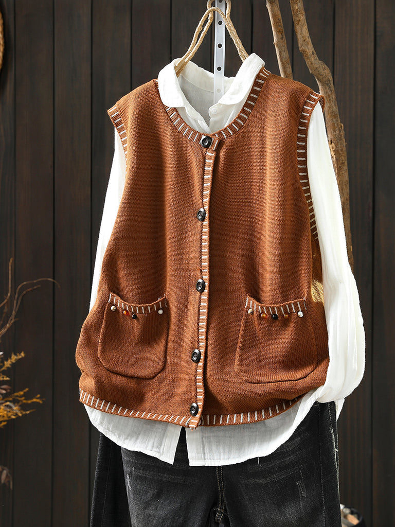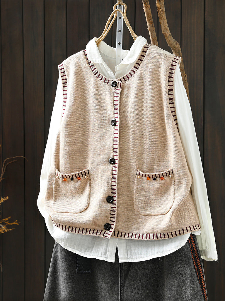 Women Artsy Flower Wave Hem O-Neck Knitted Vest