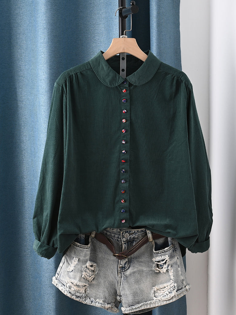 Women Artsy Pure Color Cotton Stand Collar Blouse