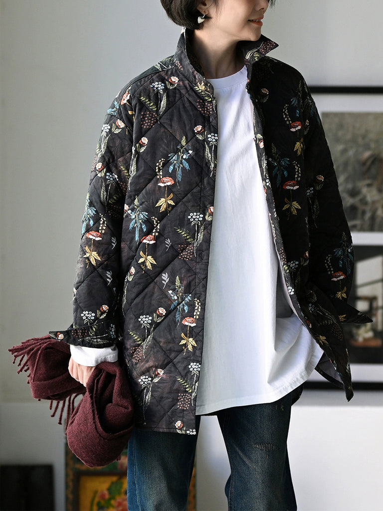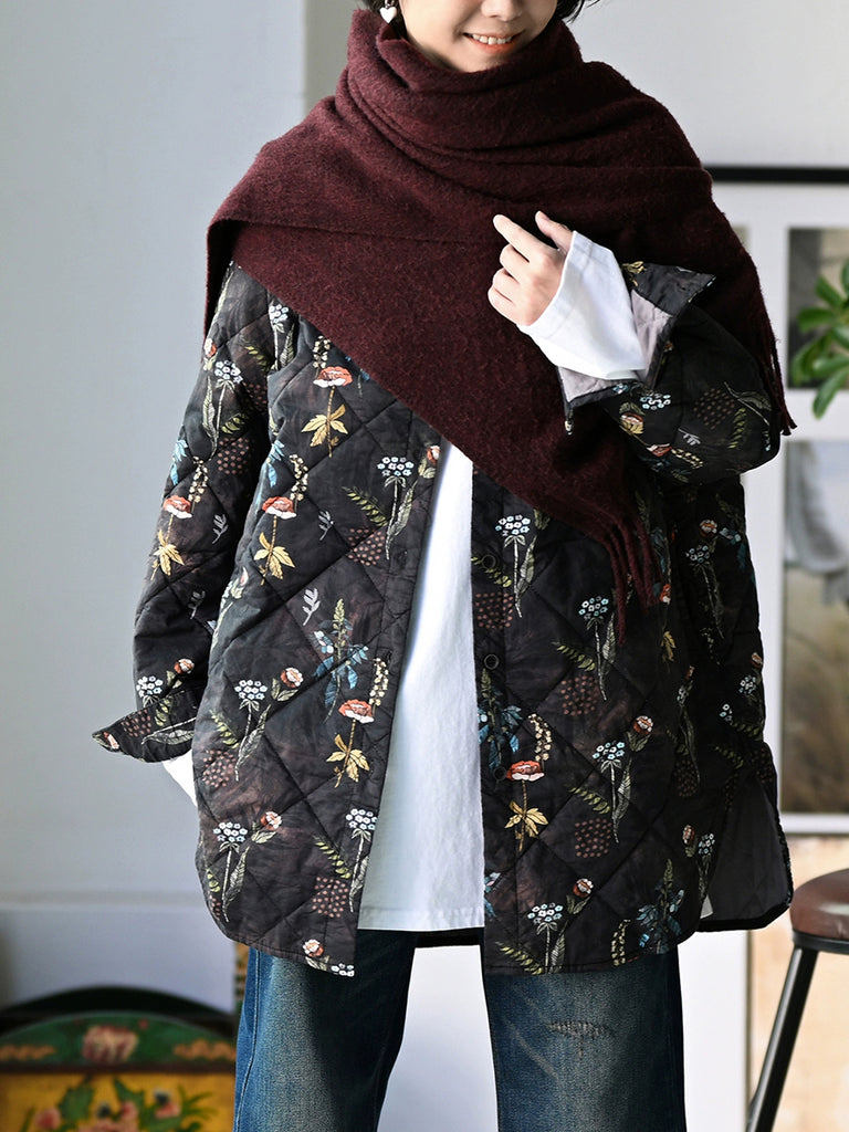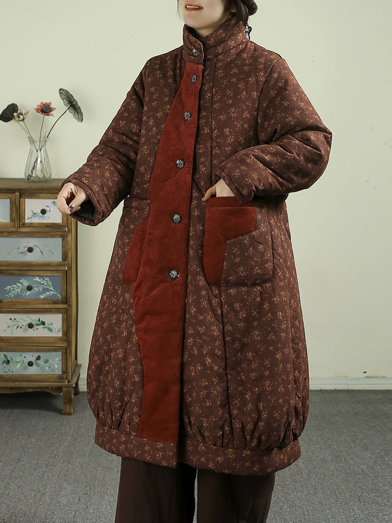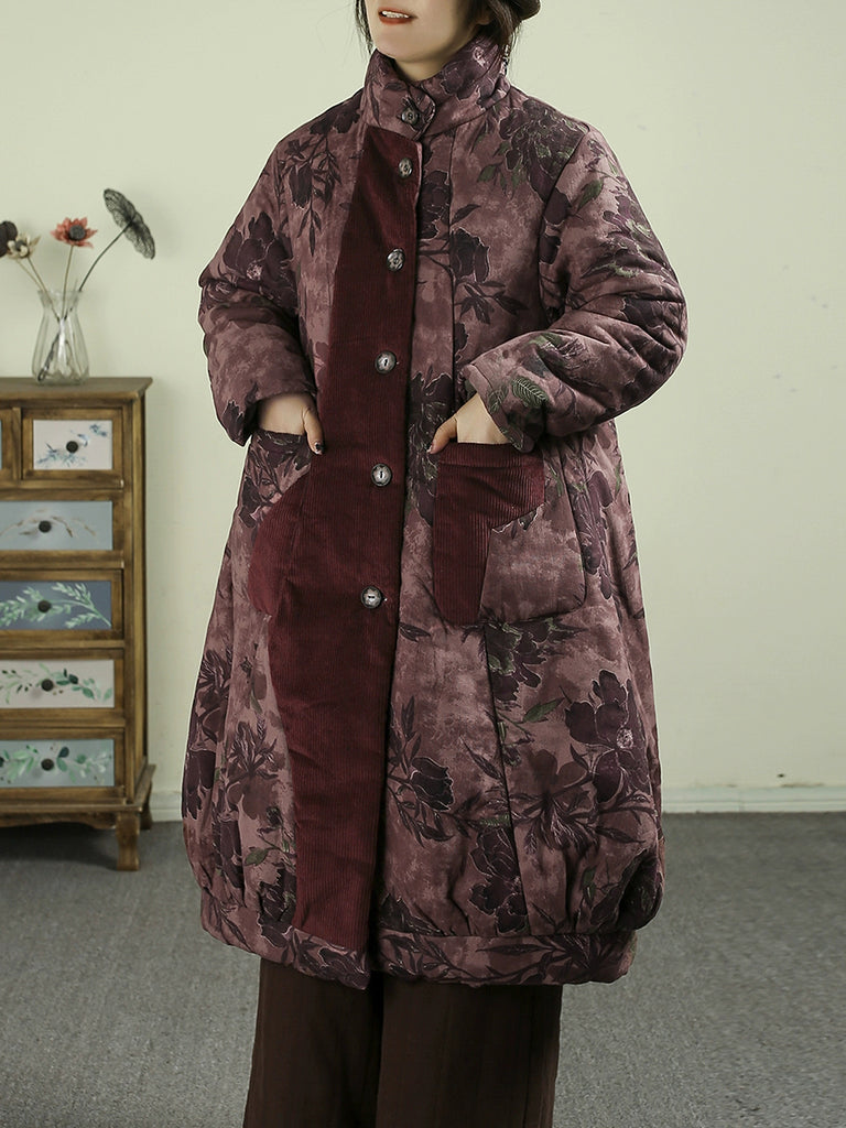 Women Winter Flower Corduroy Spliced Stand Collar Padded Coat