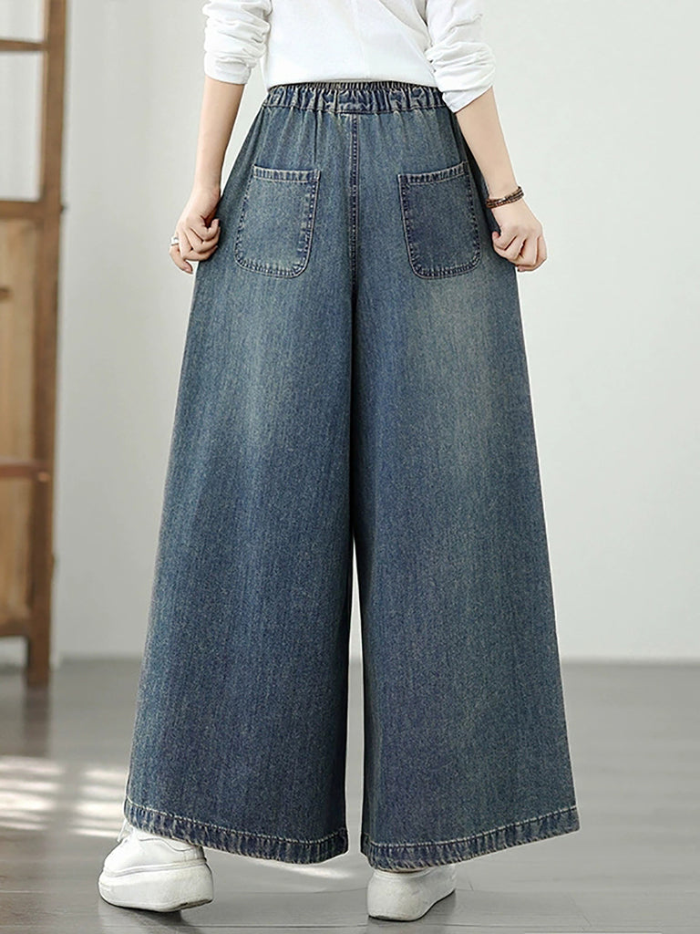 Women Autumn Artsy Embroidery Denim Wide-leg Pants