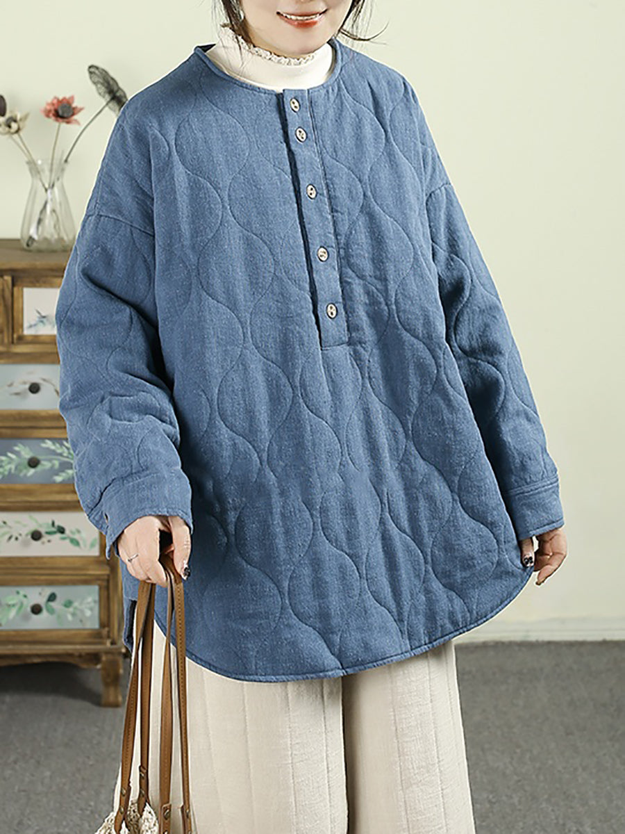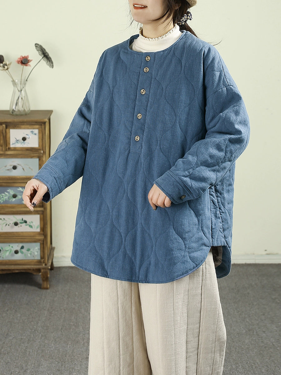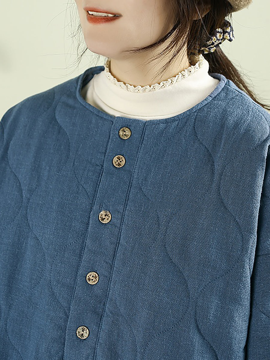 Women Winter Casual 100%Linen O-Neck Padded Coat