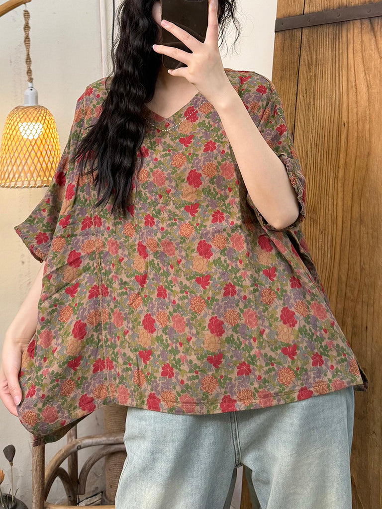Women Artsy Autumn Floral Turn-down Collar Cotton Blouse