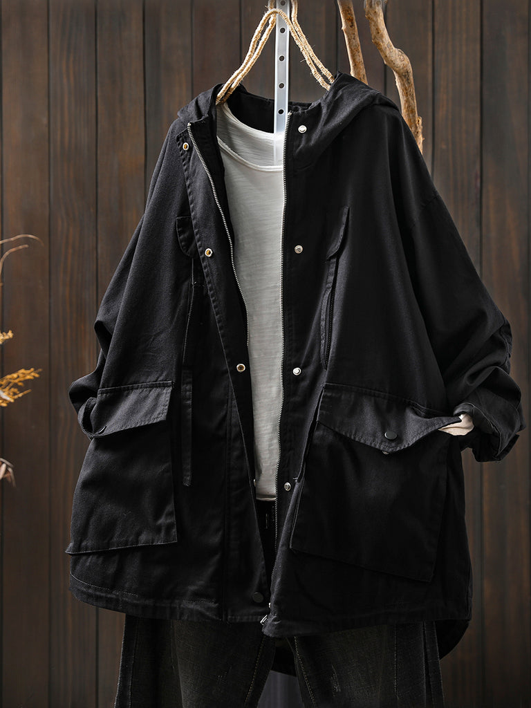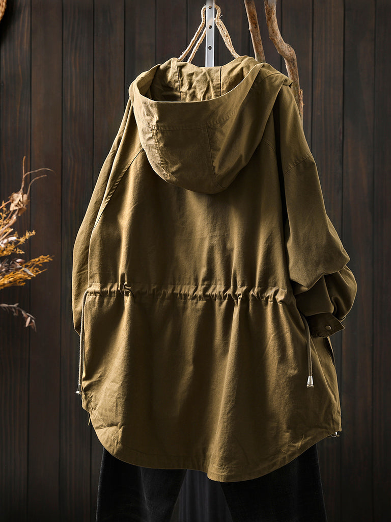 Women Autumn Pure Color 100%Cotton Hooded Coat