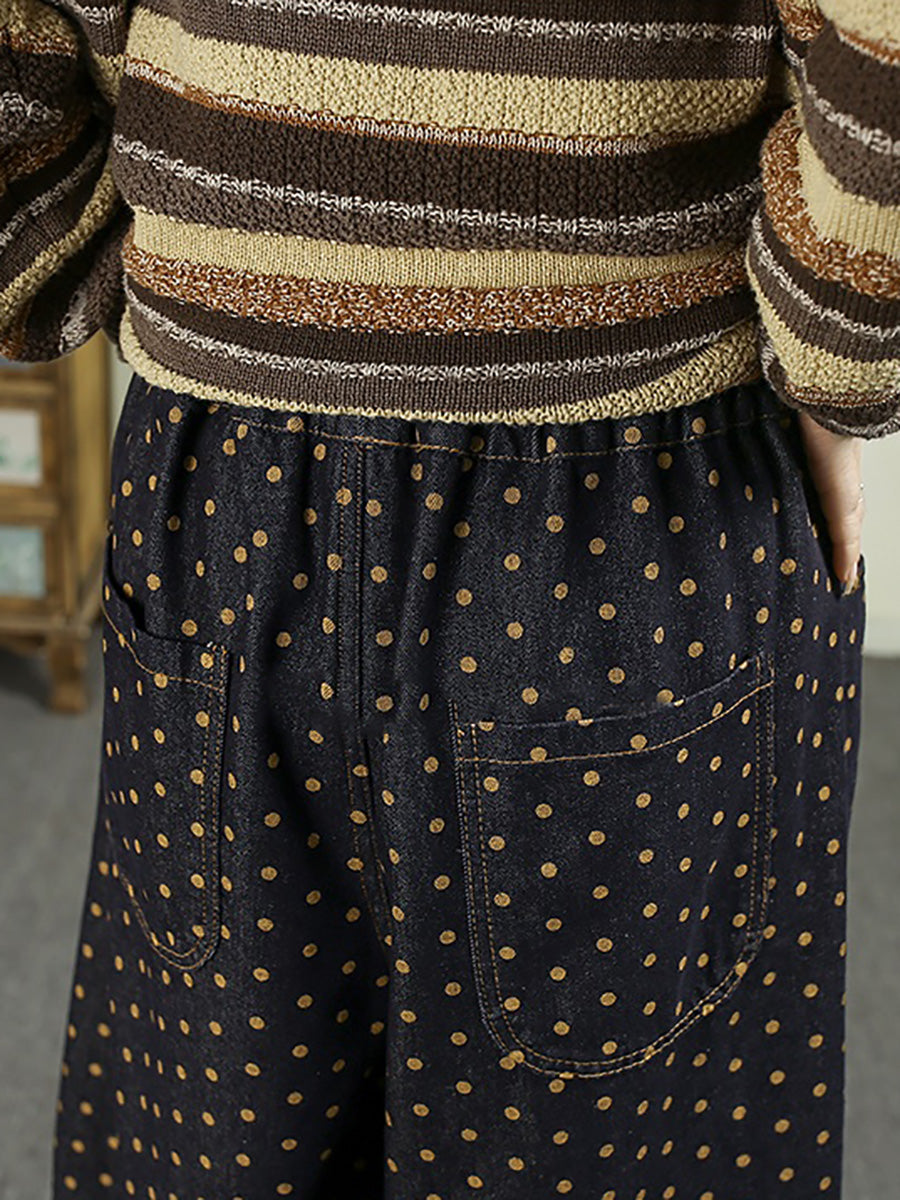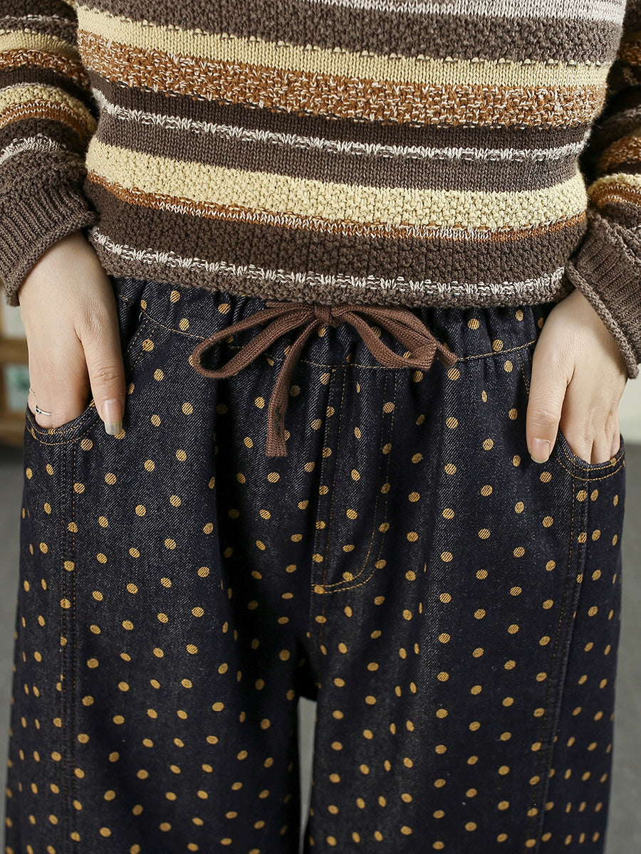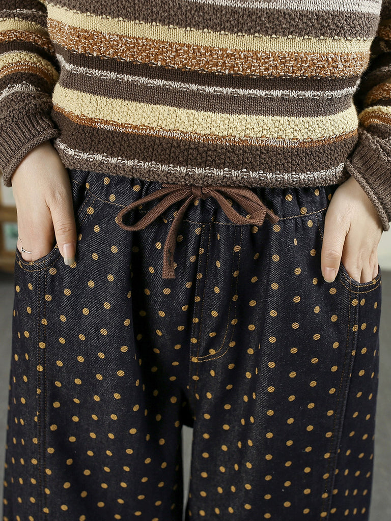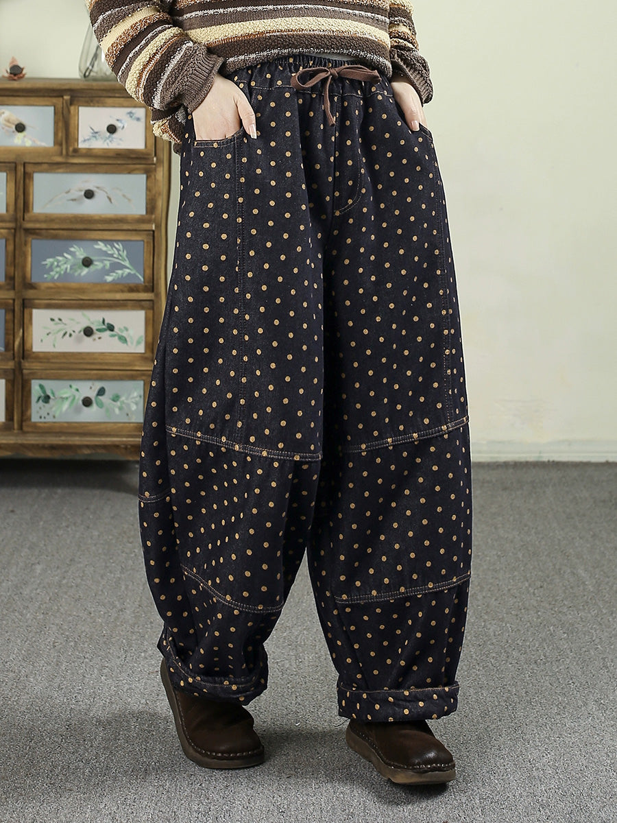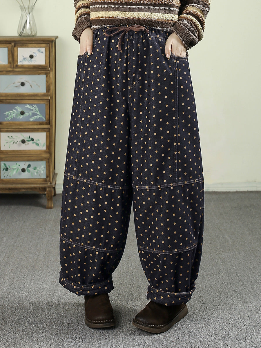 Women Winter Retro Dot Denim Fleece-lined Harem Pants