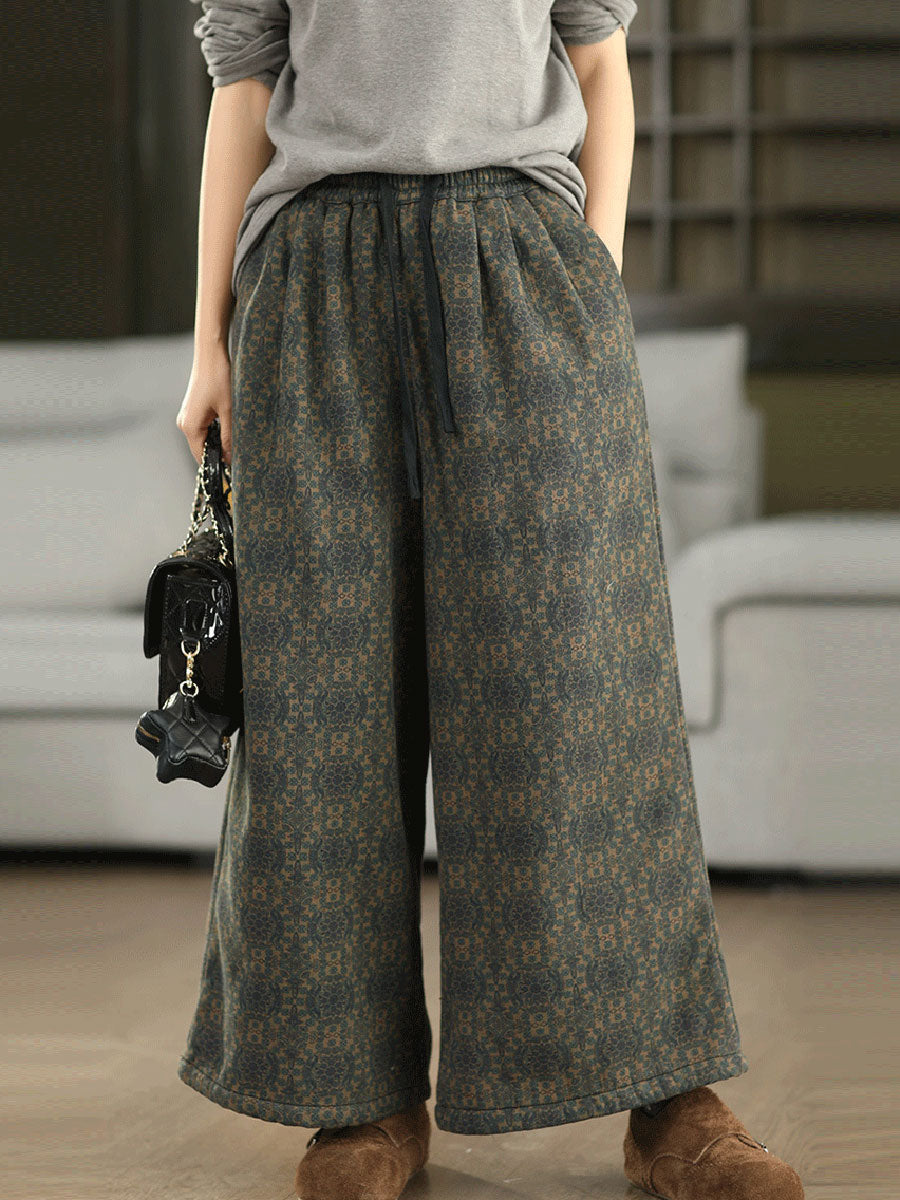 Women Winter Retro Flower Fleece-lined Straight Pants