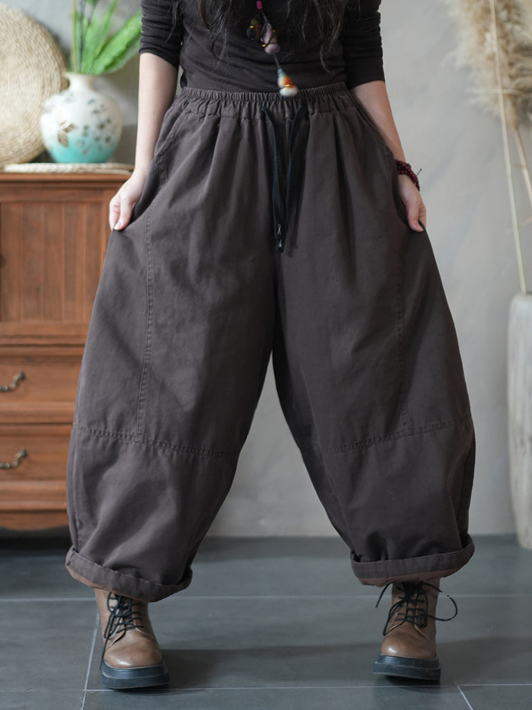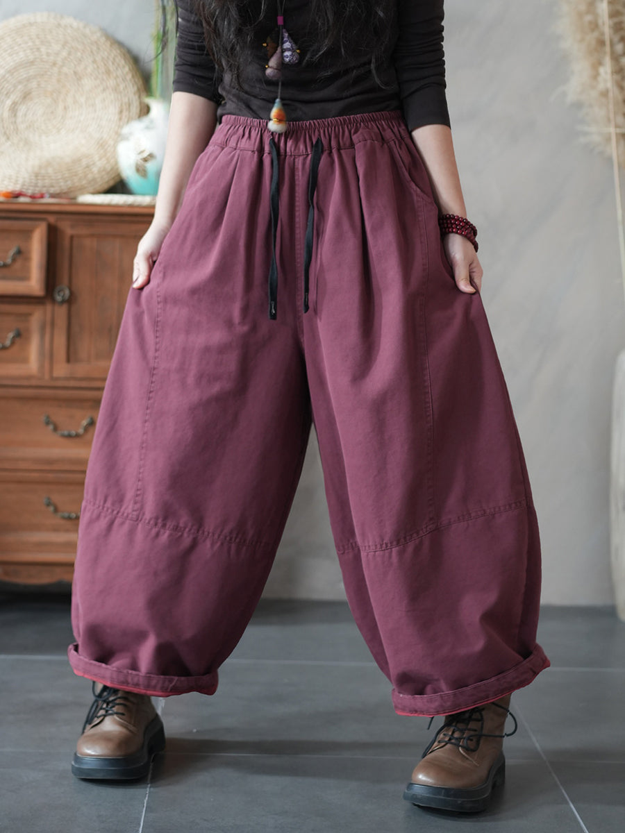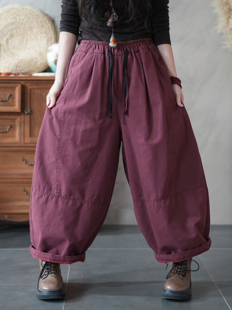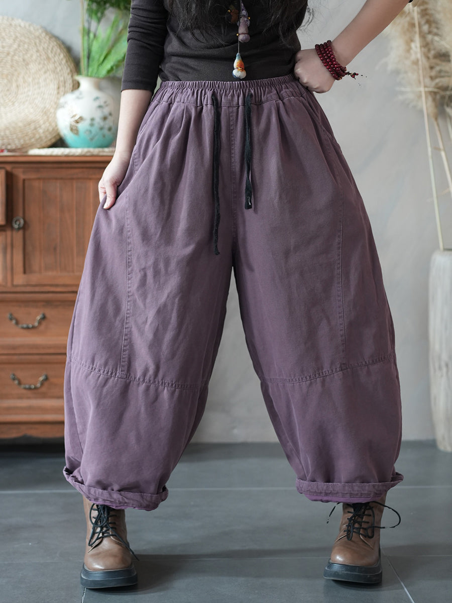 Women Winter Retro Pure Color 100%Cotton Harem Pants