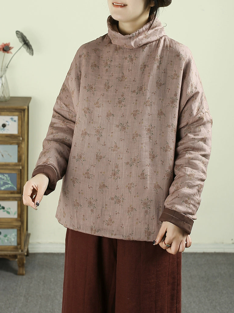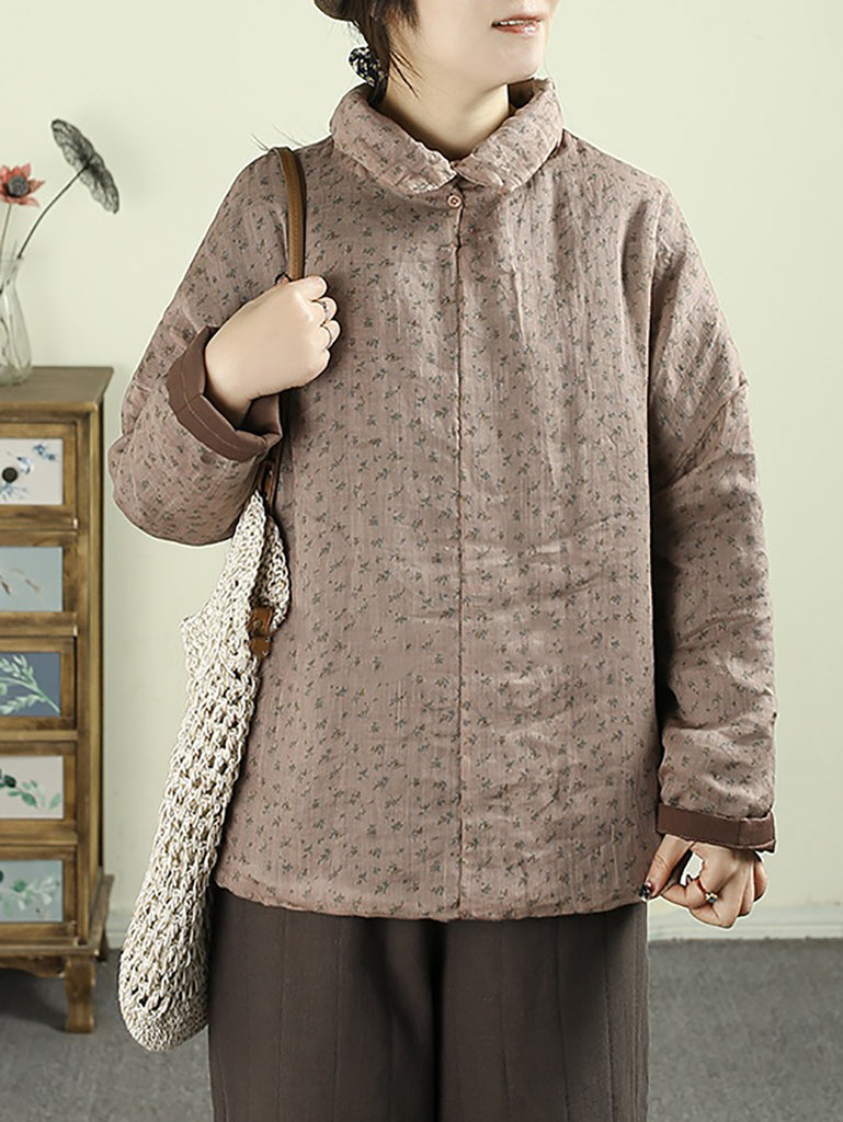Women Winter Ethnic Floral Ramie Padded Stand Collar Coat
