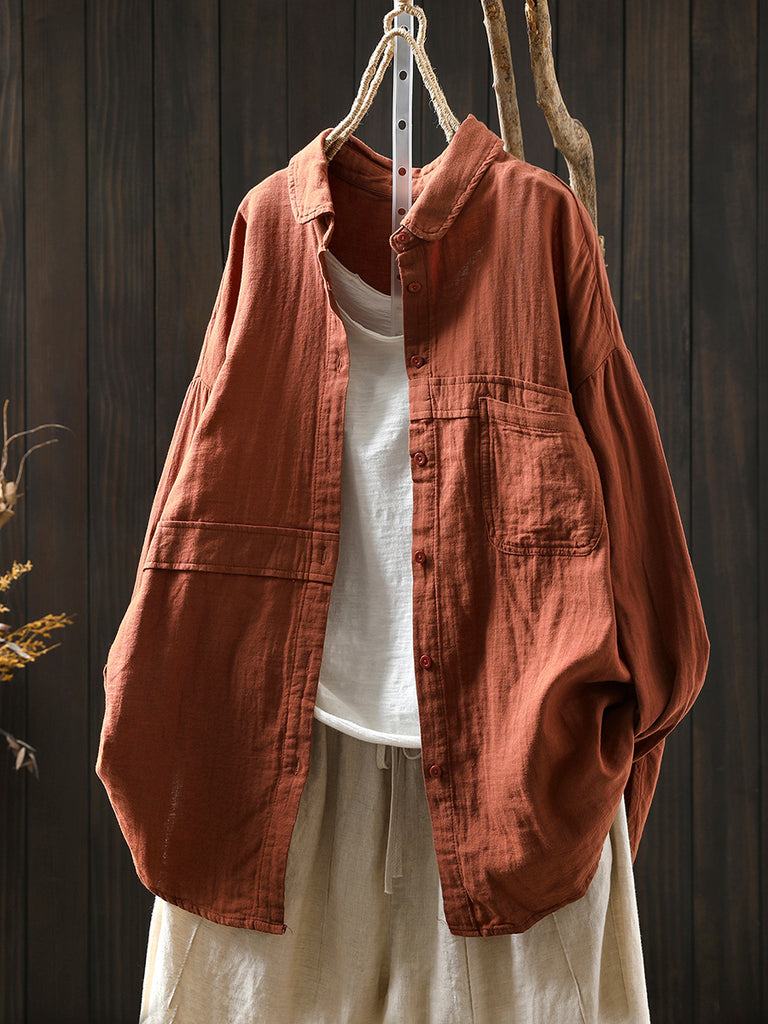 Women Pure Color Turn-down Collar 100%Cotton Shirt