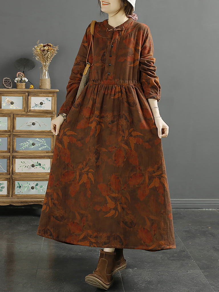 Plus Size Women Autumn Vintage Leaf Print Cotton Dress