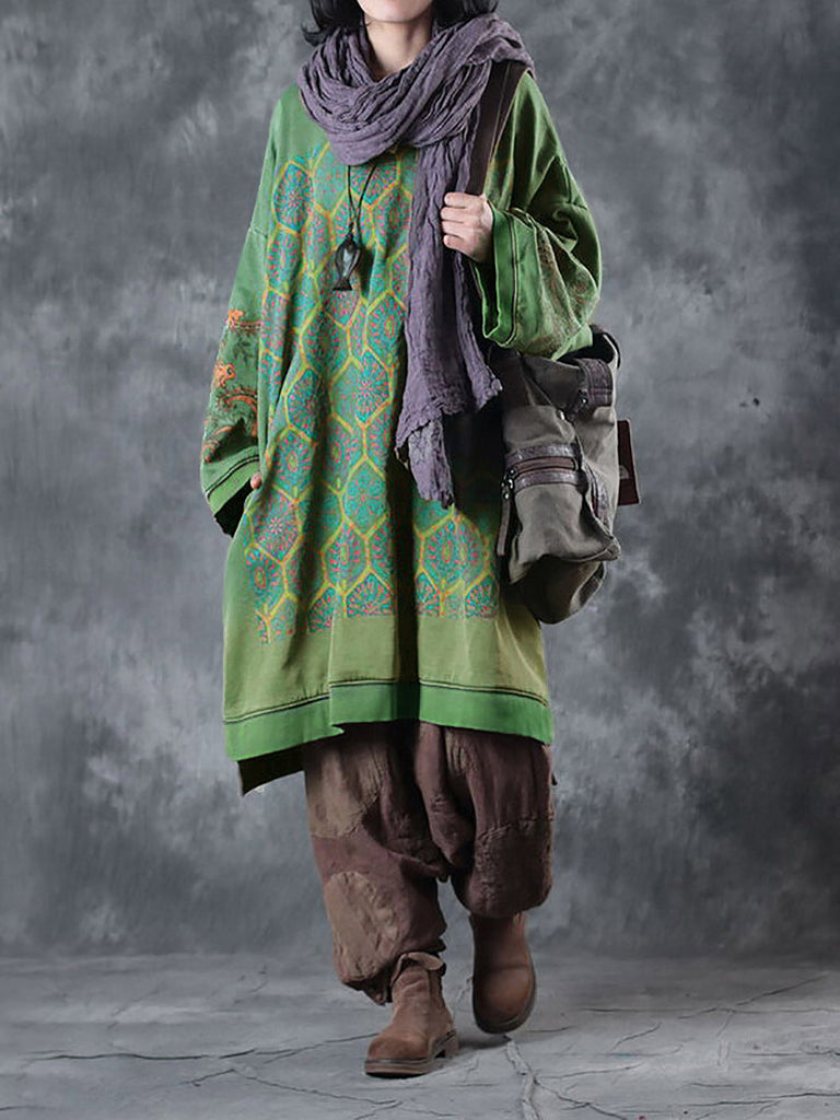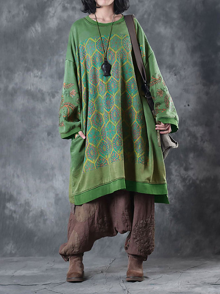 Plus Size Women Autumn Ethnic Print O-Neck Loose Cotton Dress