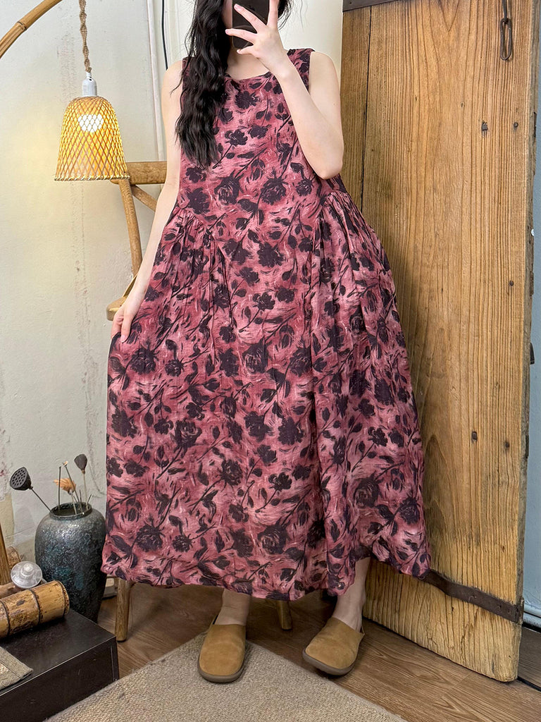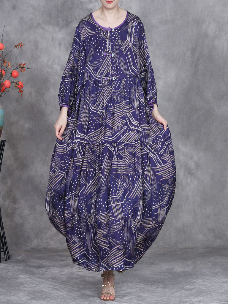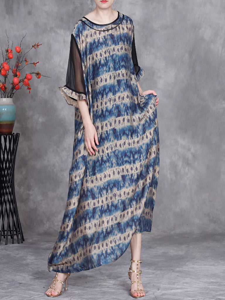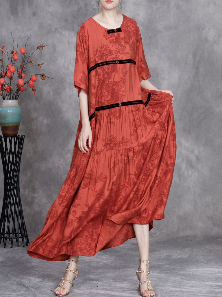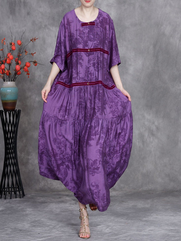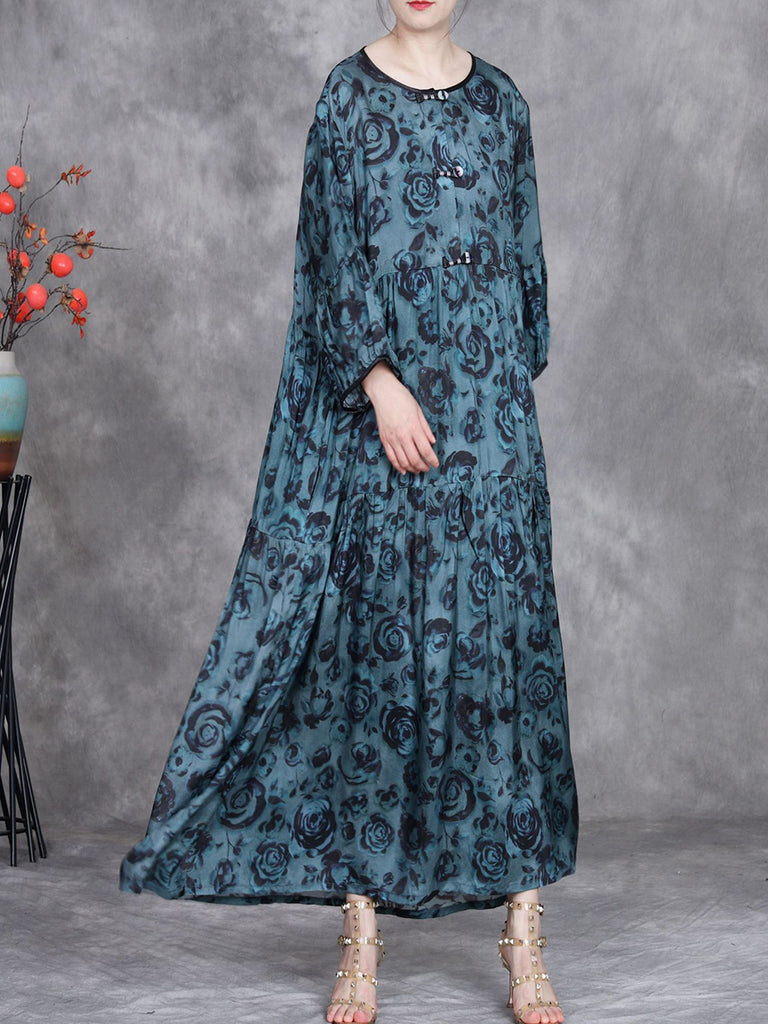 Plus Size Women Spring Retro Flower O-Neck Maxi Dress